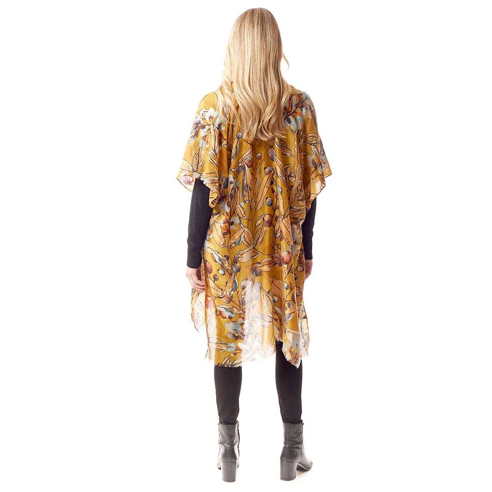Floral Printed Gold Foil Accented Ruana Poncho