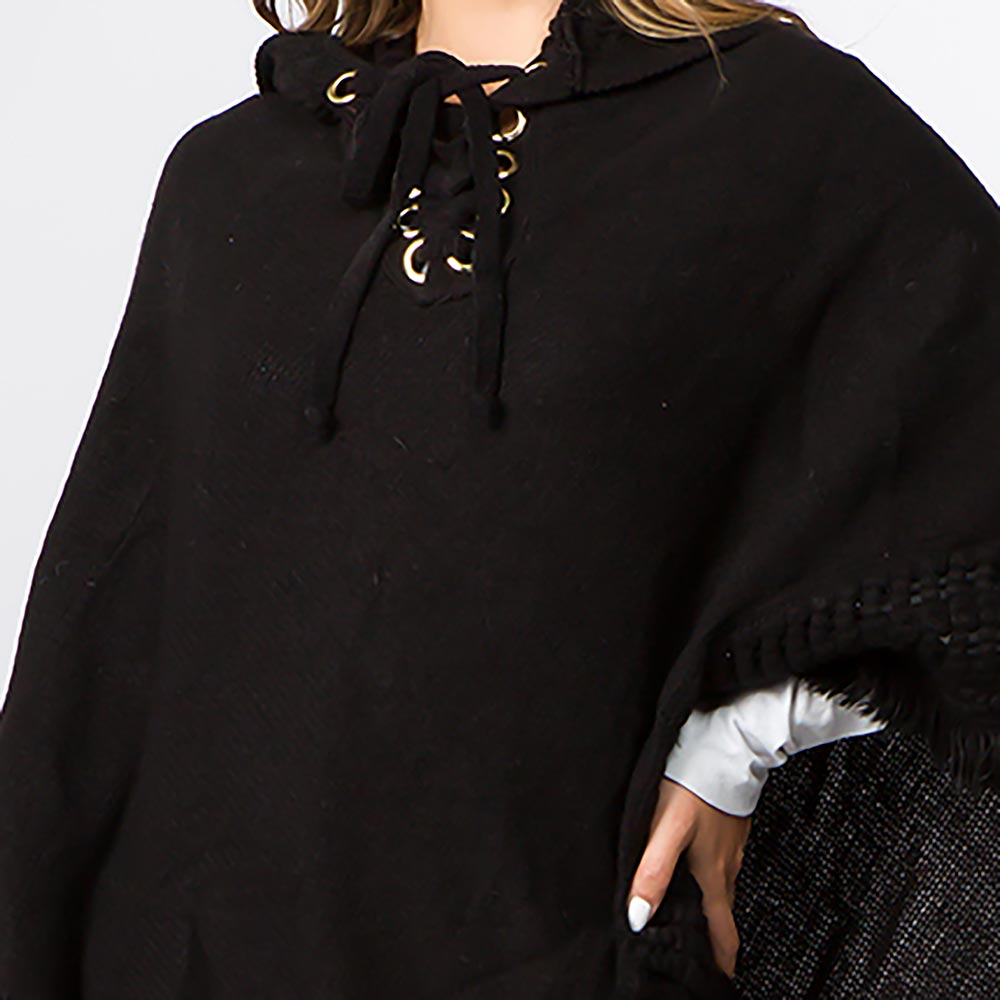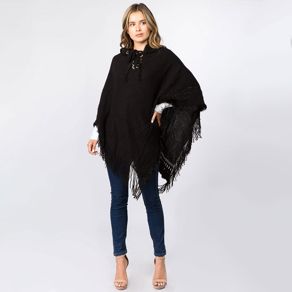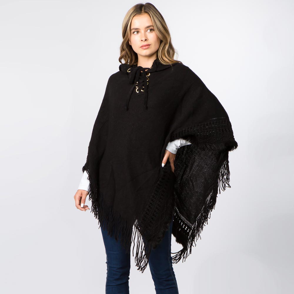 Fringe Hem Lace Up Hooded Knit Poncho Fringe Hem Lace Up Hooded Knit Poncho Fringe Hem Lace Up Hooded Knit Poncho