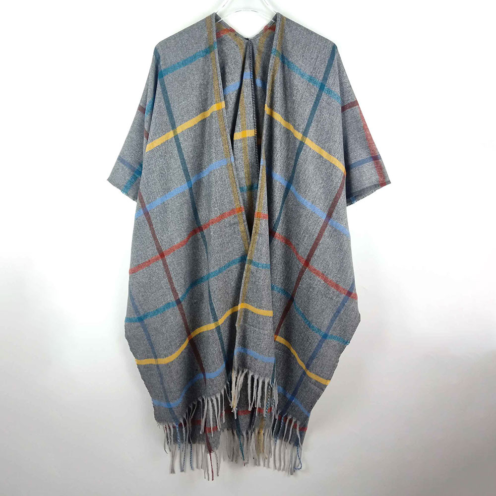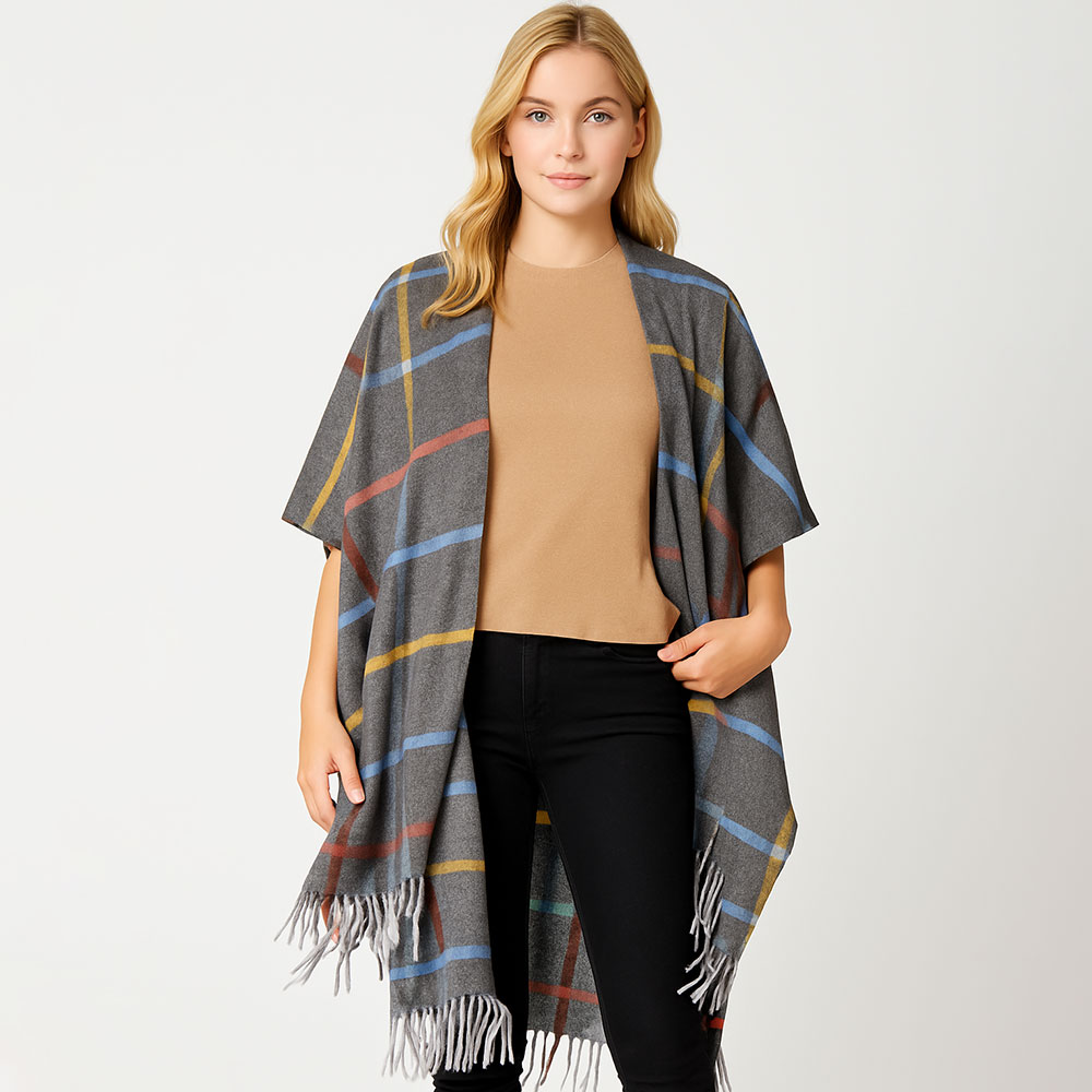 Fringe Hem Plaid Pattern Open Front Kimono Poncho Fringe Hem Plaid Pattern Open Front Kimono Poncho