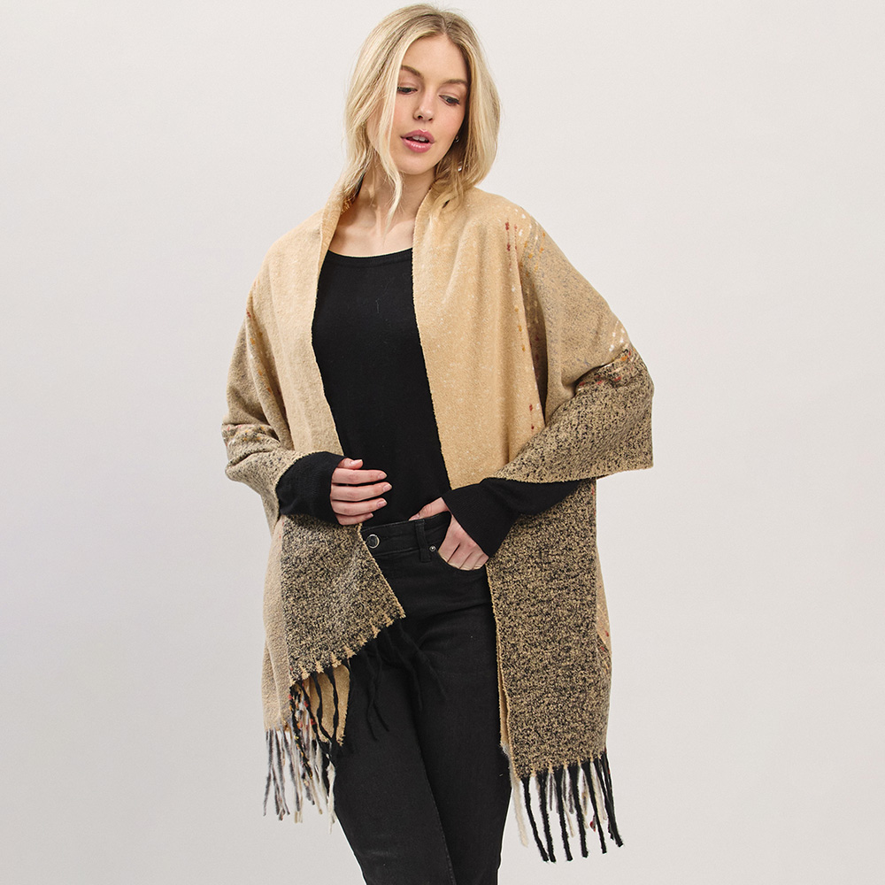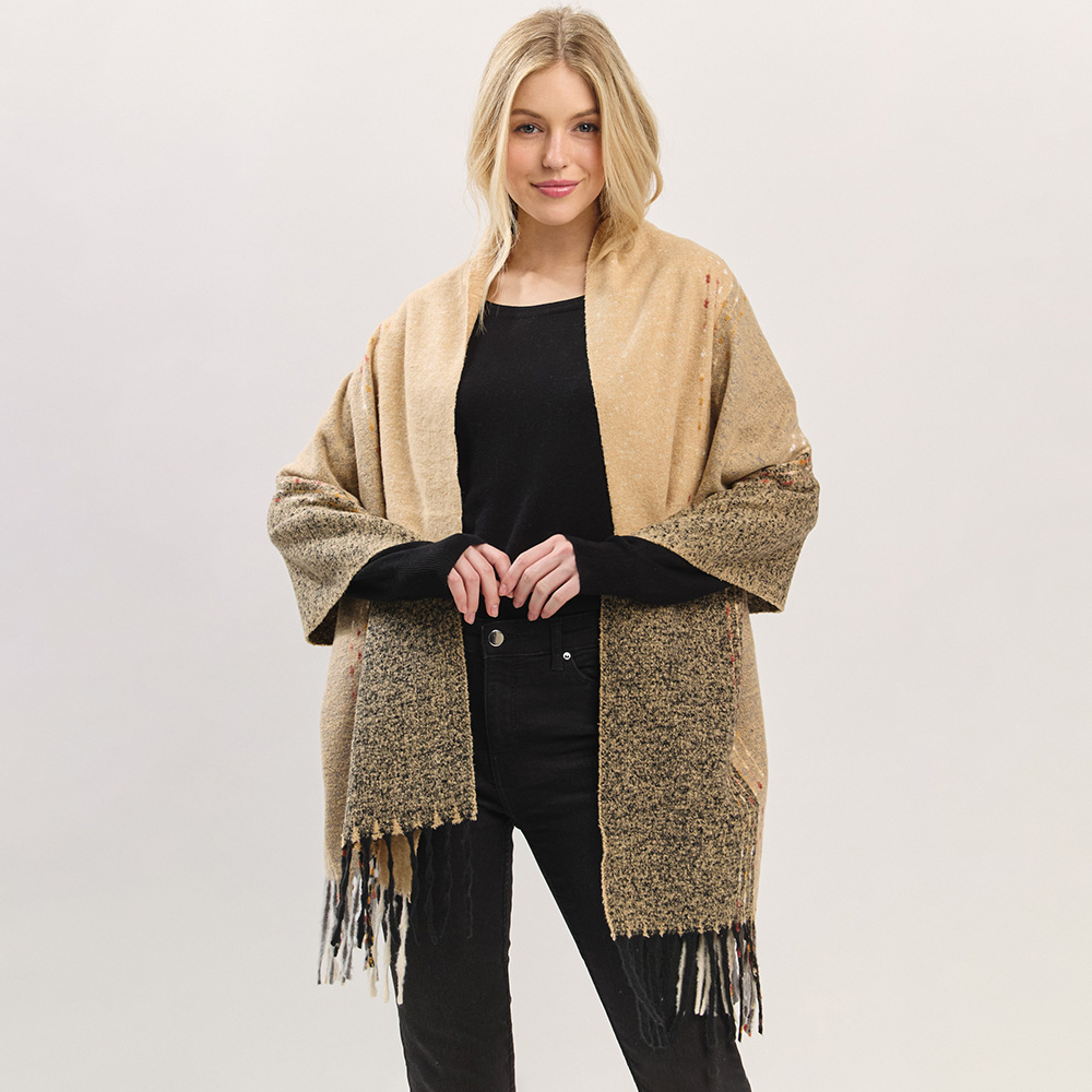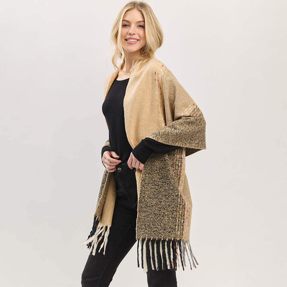 • A soft woven poncho wrap designed with a relaxed drape and finished with fringe hem details. Perfect for layering in cooler weather, this versatile style adds both warmth and effortless sophistication to everyday outfits.