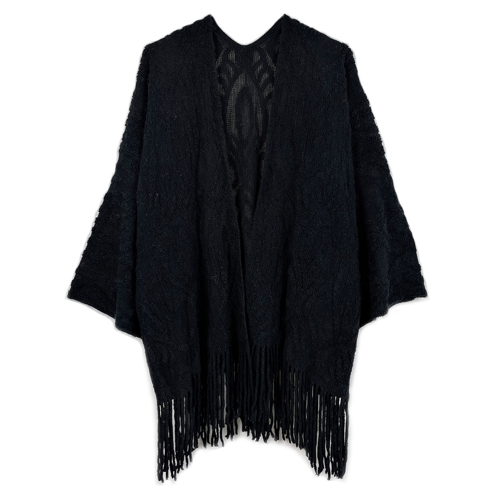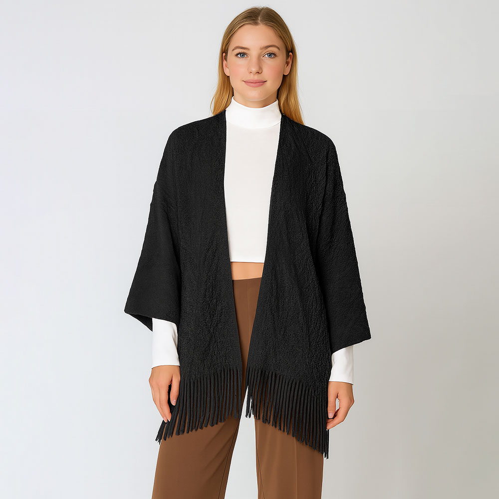 • Elegant shawl wrap with a flowing silhouette and fringe trim. Designed for effortless layering over casual or dressy outfits. A cozy and stylish accessory that adds warmth and movement to any ensemble.