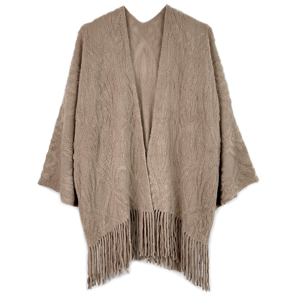 • Elegant shawl wrap with a flowing silhouette and fringe trim. Designed for effortless layering over casual or dressy outfits. A cozy and stylish accessory that adds warmth and movement to any ensemble.