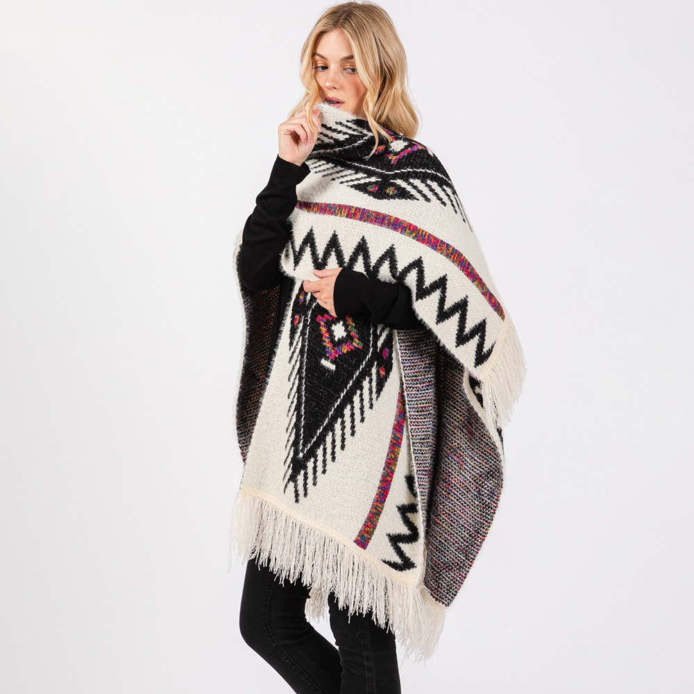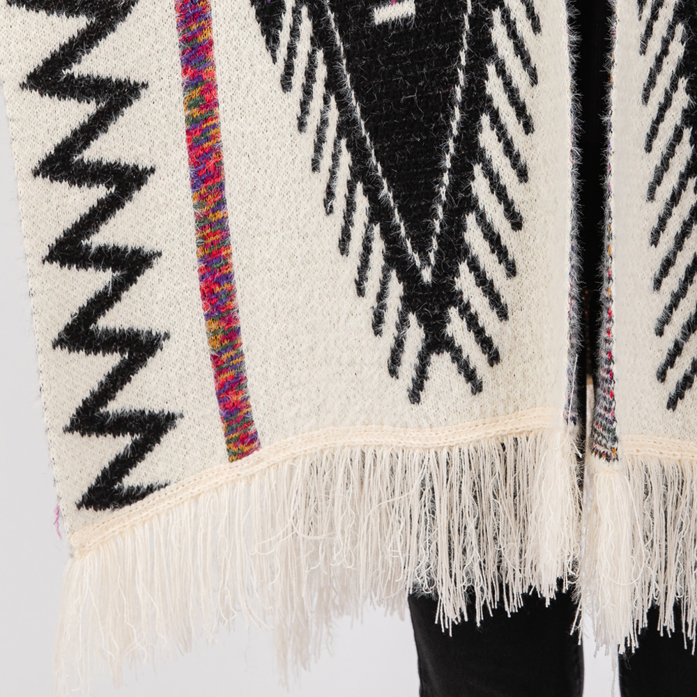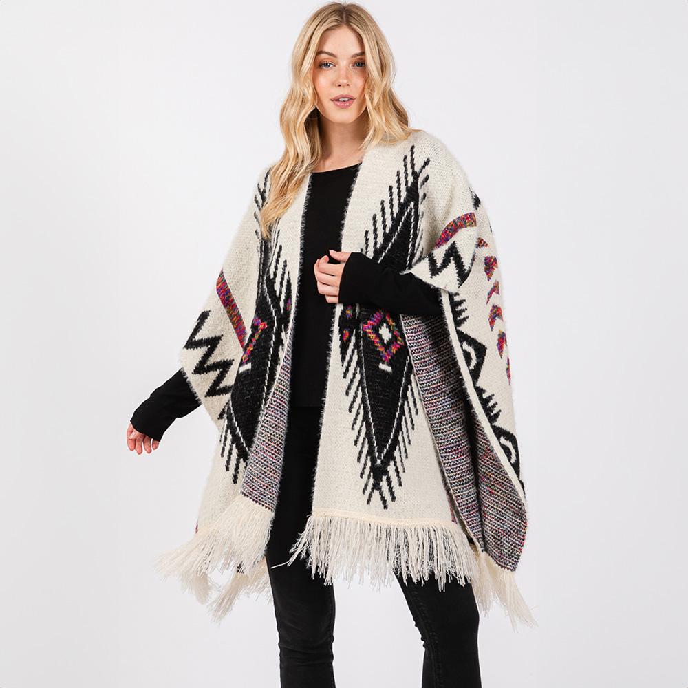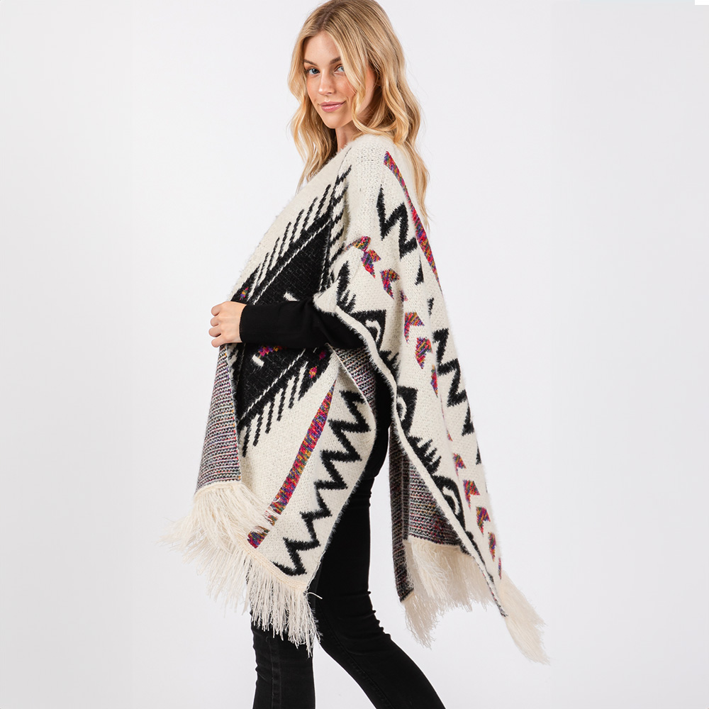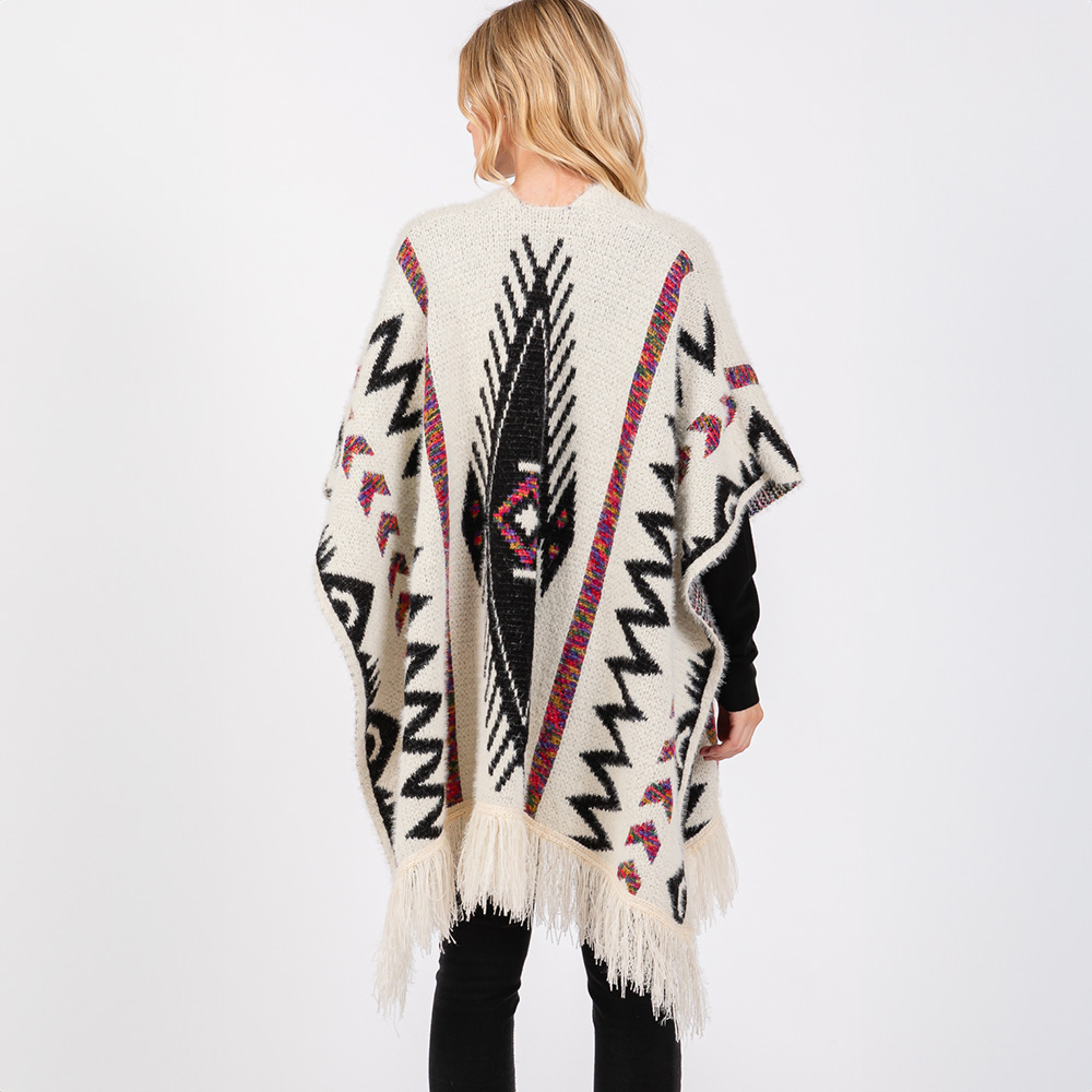 Fuzzy Aztec Pattern Tassel Knit Ruana Poncho