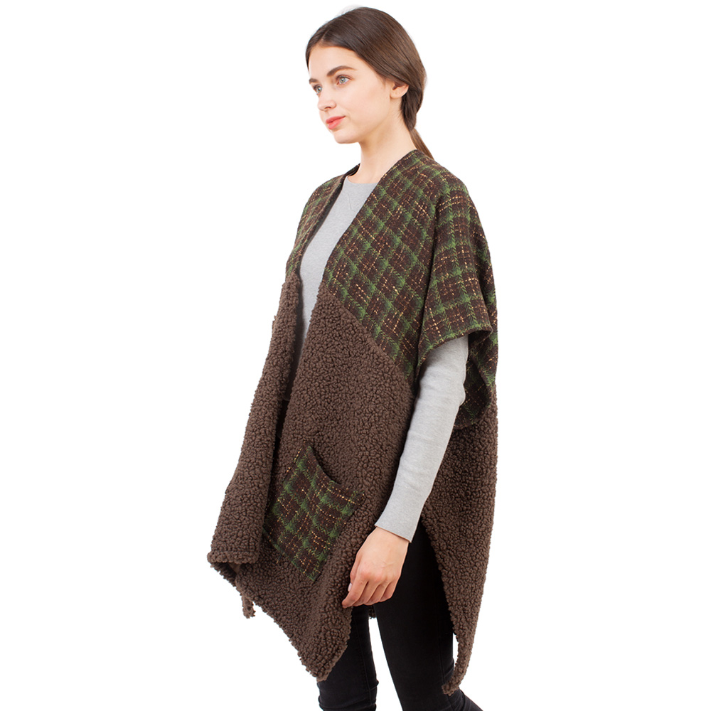 Details • Size : 29.5" X 35.4" • Material : 100% Polyester • Cozy open-front vest featuring a plaid upper panel and soft textured body. Designed with convenient front pockets and a relaxed fit, it's an ideal layering piece for casual comfort and seasonal warmth.