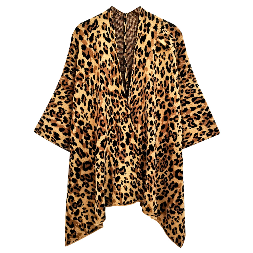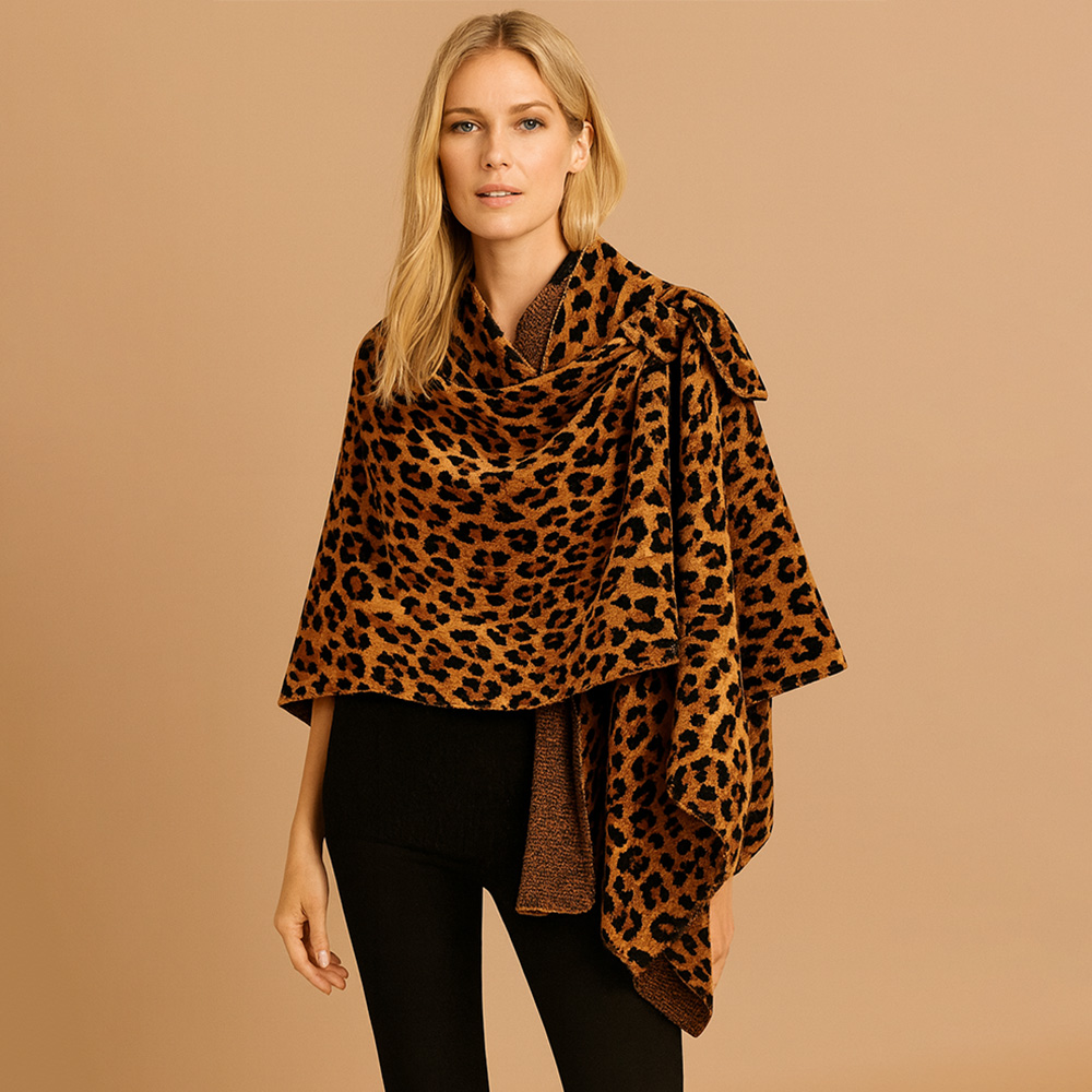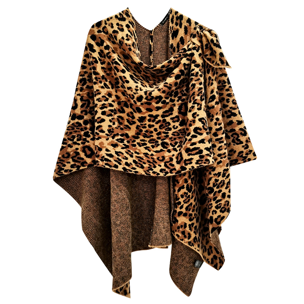 Details • Size : 43.43" X 27.6" • Material : 100% Acrylic • Elevate your wardrobe with this leopard print knit shawl, designed for both warmth and sophistication. Its draped silhouette and soft texture make it a perfect accessory for layering, offering a refined statement that transitions effortlessly from day to night.