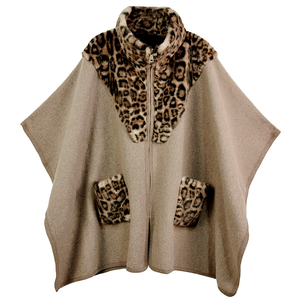 Details • Size : 43.7" X 30.7" • Material : 100% Acrylic • Stay stylish and warm with this zip-up cape featuring a bold leopard print collar, accents, and matching pockets. Its relaxed fit and chic design make it a standout layering piece, perfect for casual outings or dressing up cold-weather looks with elegance and personality.