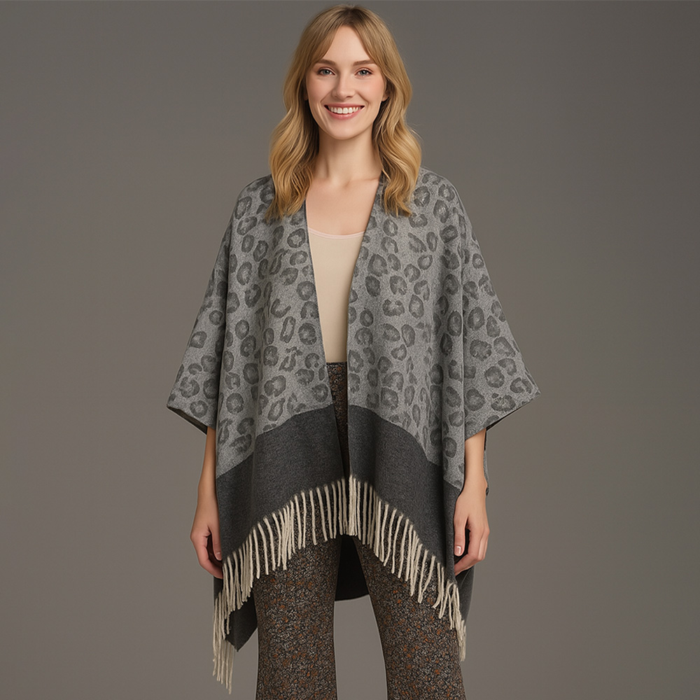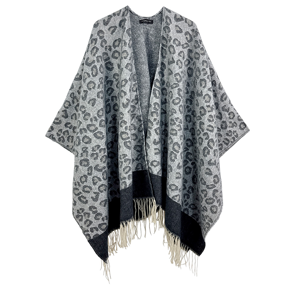 Details • Size : 51.1" X 33" • Material : 100% Acrylic • Make a bold statement with this leopard print open front cape featuring a fringe hem for added flair. Its flowing silhouette and eye-catching design make it the perfect layering piece to elevate casual or dressy outfits, offering comfort, warmth, and standout style for any season.
