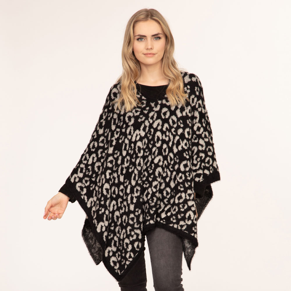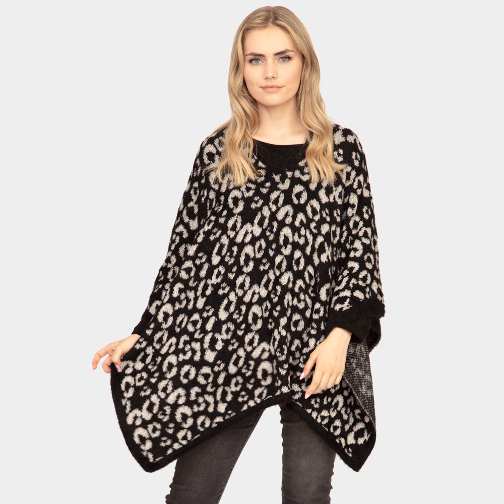 • Stylish leopard print knit poncho with soft, flowing silhouette and cozy feel. Features a relaxed fit that layers easily over any outfit. Ideal for adding warmth and fashion-forward flair to your look.