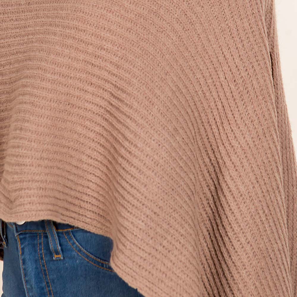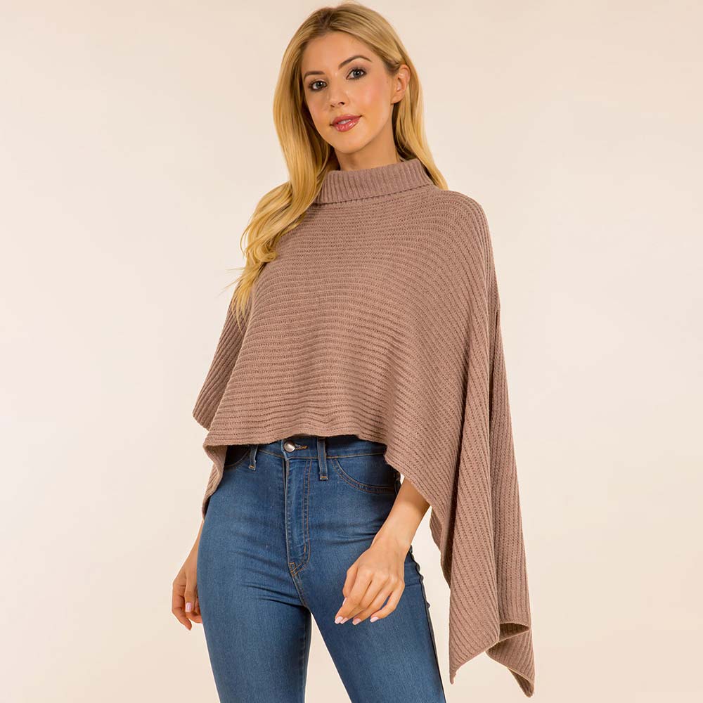 Details • Size : One Size • Material : 100% Acrylic • Elevate your outerwear with this ribbed knit poncho featuring a cozy mock neck and flowing asymmetrical hem. Designed for effortless layering and chic coverage, it delivers comfort and sophistication in one stylish silhouette for seasonal dressing.