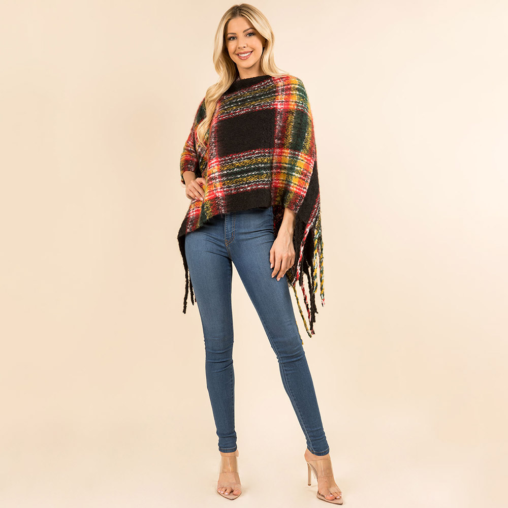• Stay cozy and stylish with this plaid poncho featuring a soft textured feel and dramatic fringe hem. Perfect for layering over any outfit, it adds instant warmth and timeless elegance to your fall and winter wardrobe.