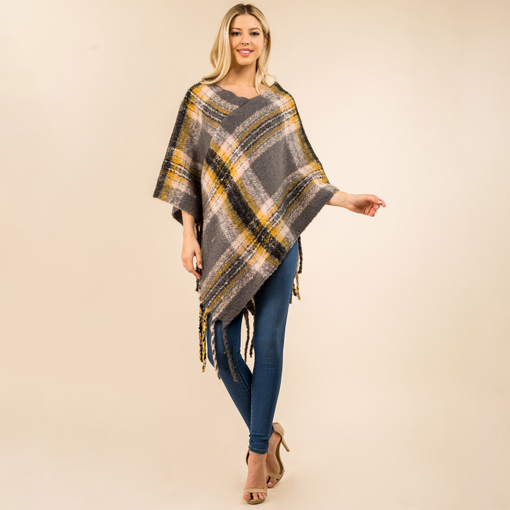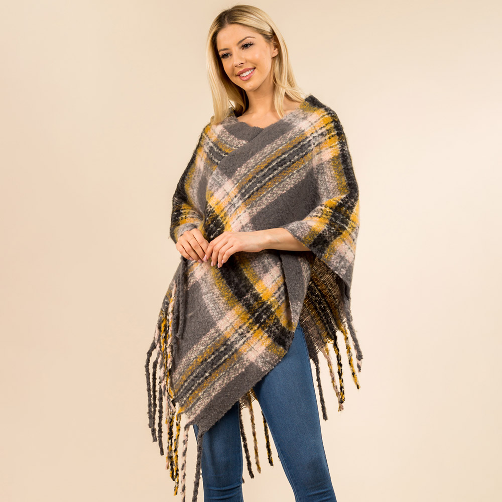 Details • Size : One Size • Material : 100% Acrylic • Stay cozy and stylish with this plaid poncho featuring a soft textured feel and dramatic fringe hem. Perfect for layering over any outfit, it adds instant warmth and timeless elegance to your fall and winter wardrobe.
