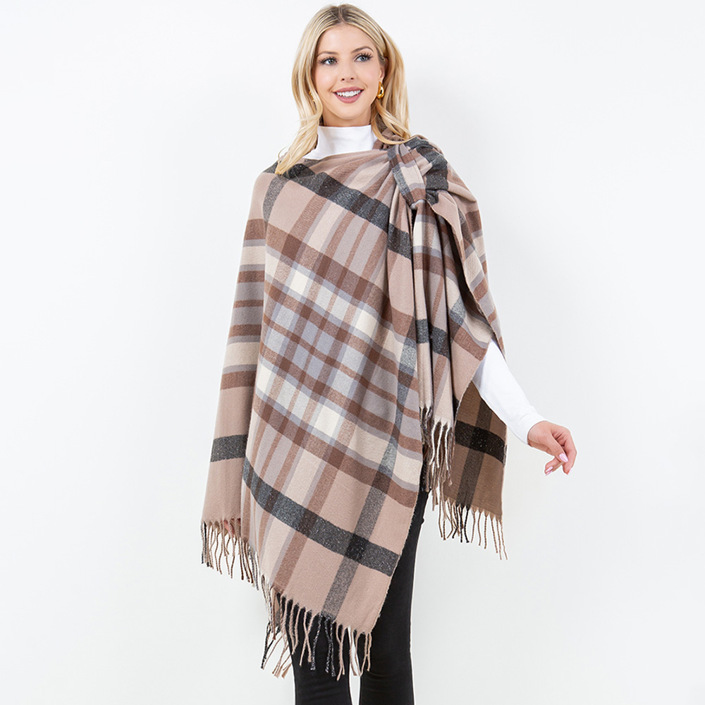 • Wrap yourself in comfort and timeless style with this plaid oversized shawl. Designed with soft fringe detailing, it can be worn as a wrap, poncho, or scarf. Perfect for layering over casual or dressy outfits, it adds warmth and chic flair to any ensemble.