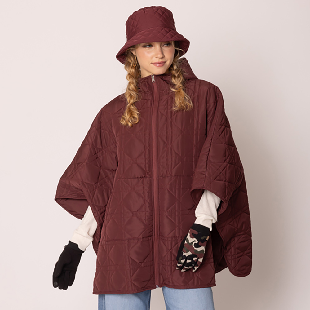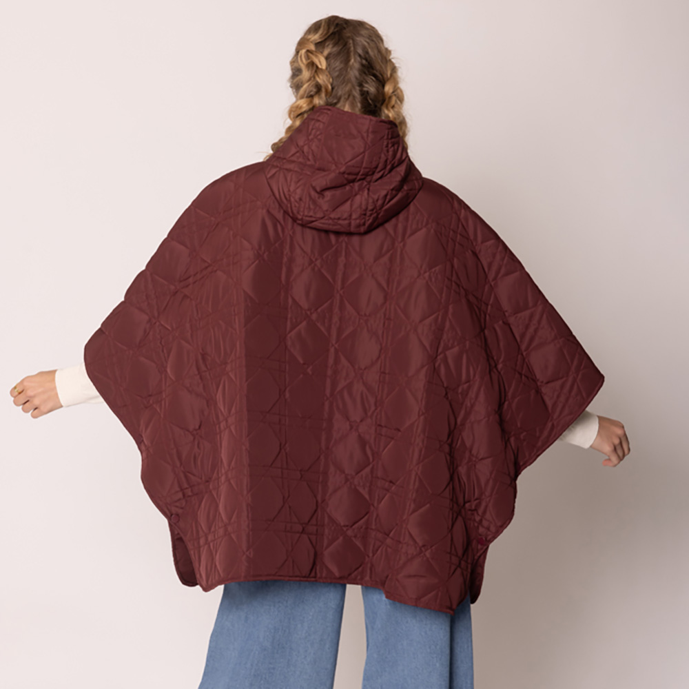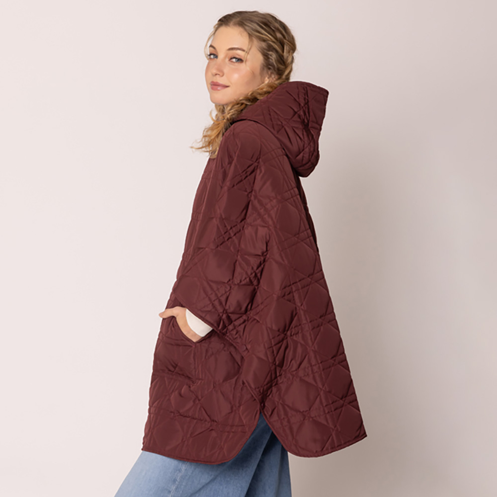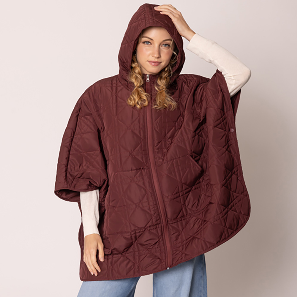 • Stay cozy and chic in this quilted hooded poncho jacket. Featuring a relaxed fit, wide sleeves, and lightweight padding, it’s perfect for layering in cooler weather. The front zip closure, side pockets, and attached hood add both function and style, making it an effortless outerwear piece for casual days, travel, or weekend outings. A modern twist on a classic poncho, designed for comfort and versatility.