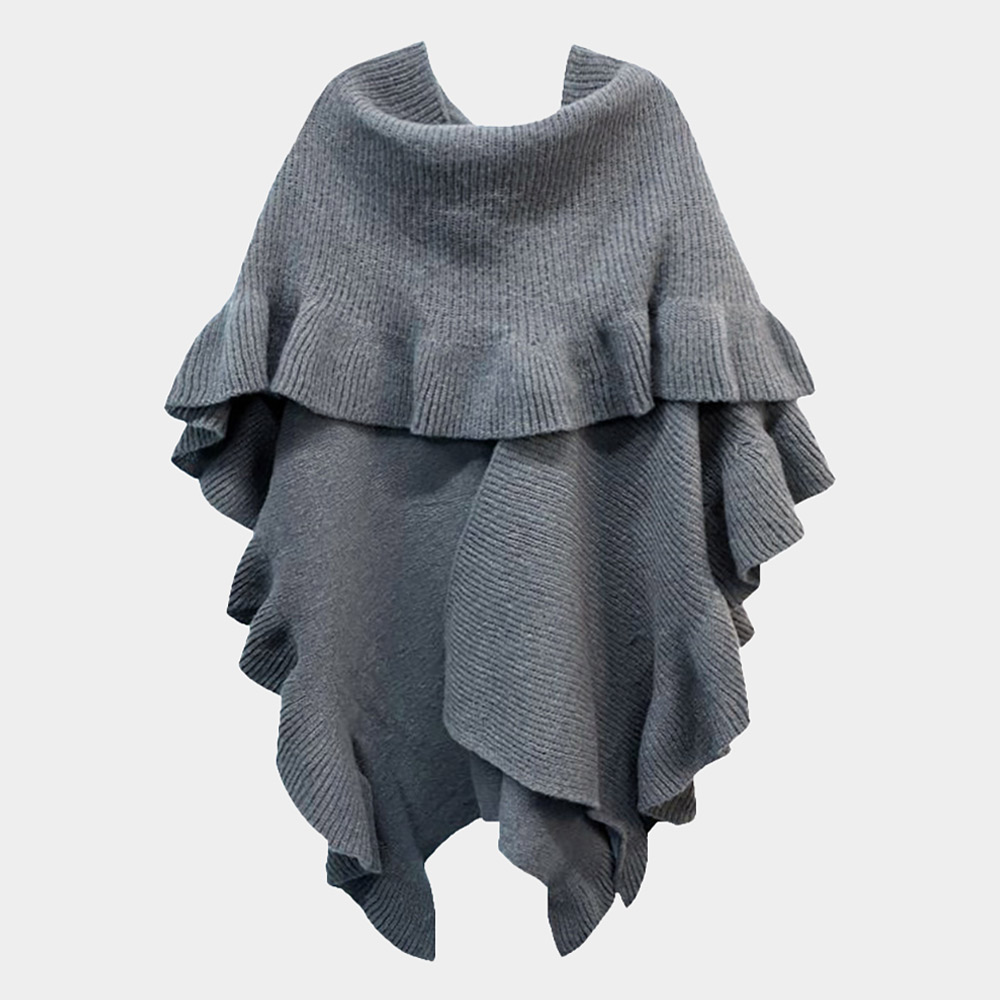 Details • Size : 34" X 30" • Material : 100% Polyester • Stay stylish and cozy with this elegant ruffled knit shawl wrap ruana featuring a soft drape and feminine detailing. Perfect for layering over dresses or casual outfits, it adds warmth and sophistication, making it a versatile accessory for day-to-night looks and all-season wear.
