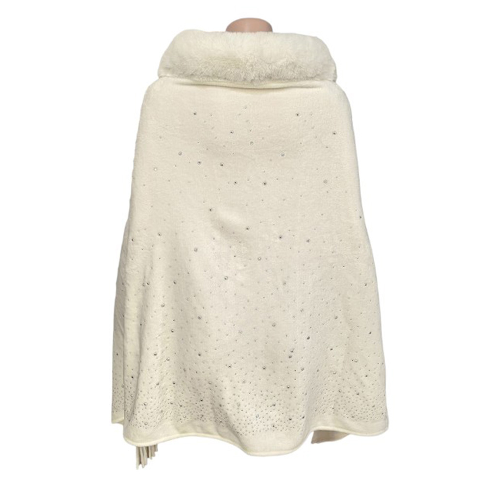 Details • Size : One Size • Material : 100% Polyester • Elegant faux fur shawl wrap featuring soft texture, fringe trim, and subtle rhinestone accents for added sparkle. Perfect for evening events, parties, or cold-weather outings, this luxurious wrap adds warmth and sophistication to any outfit with timeless charm.