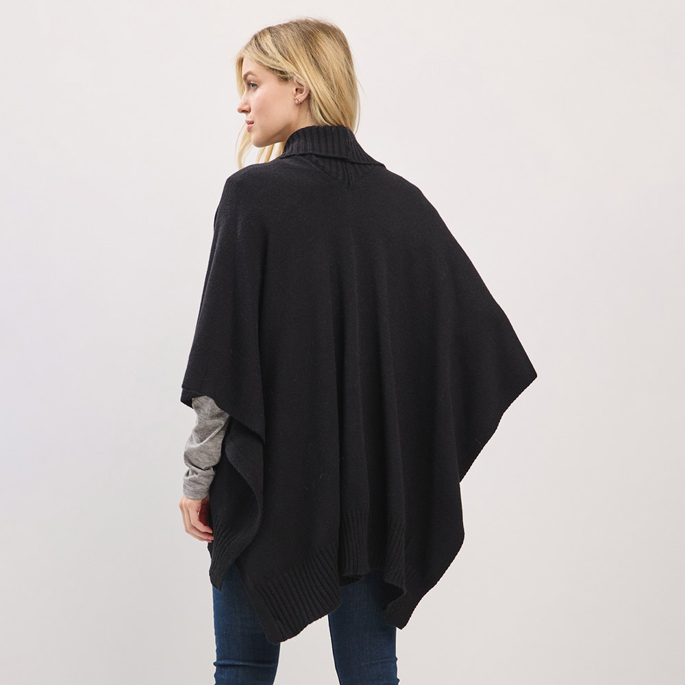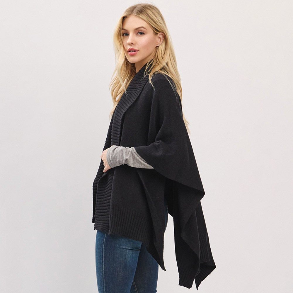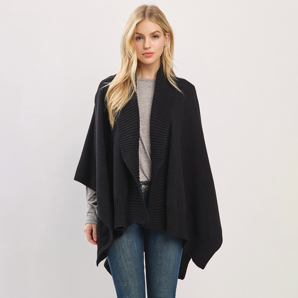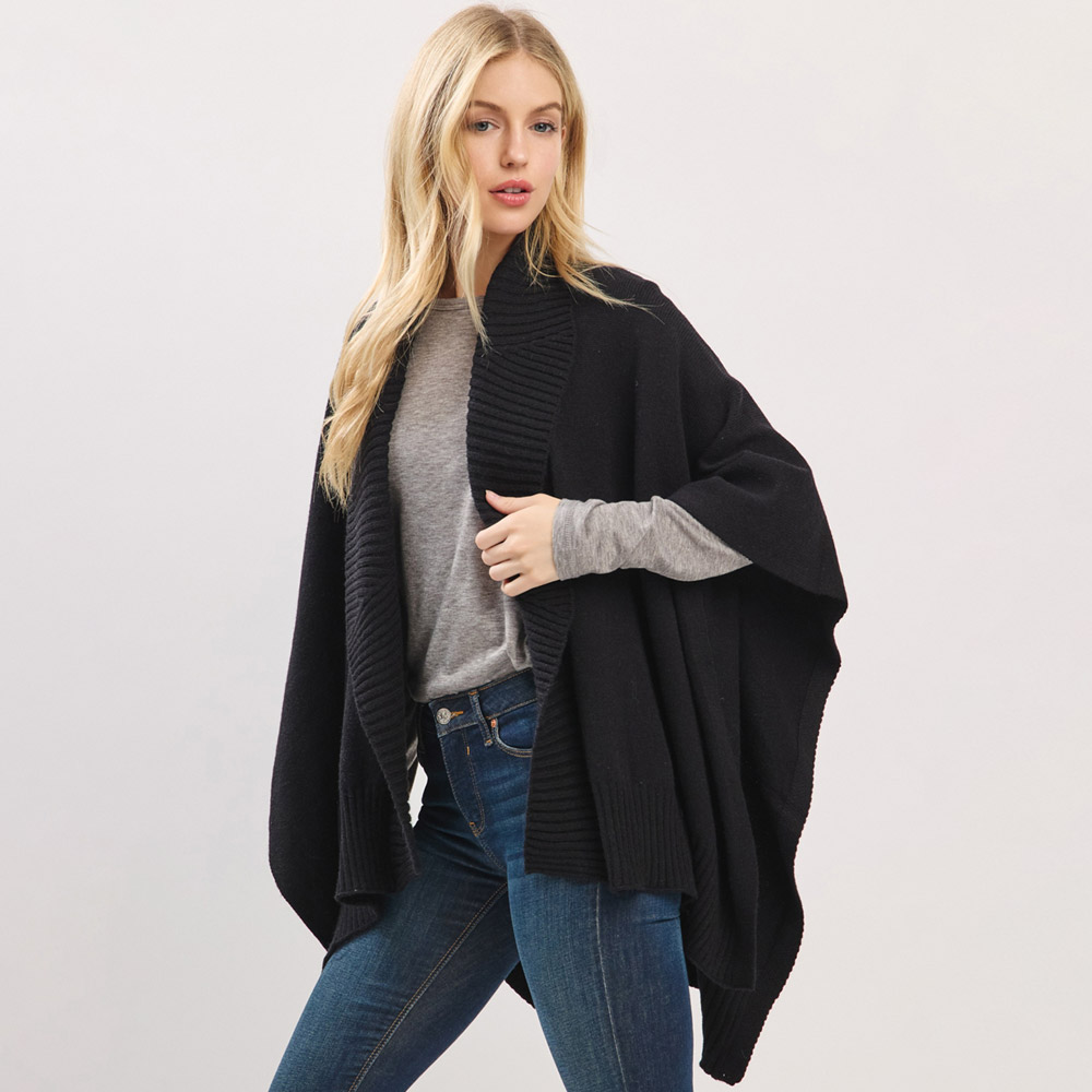 Ribbed Trim Open Front Soft Knit Shawl Cape Poncho