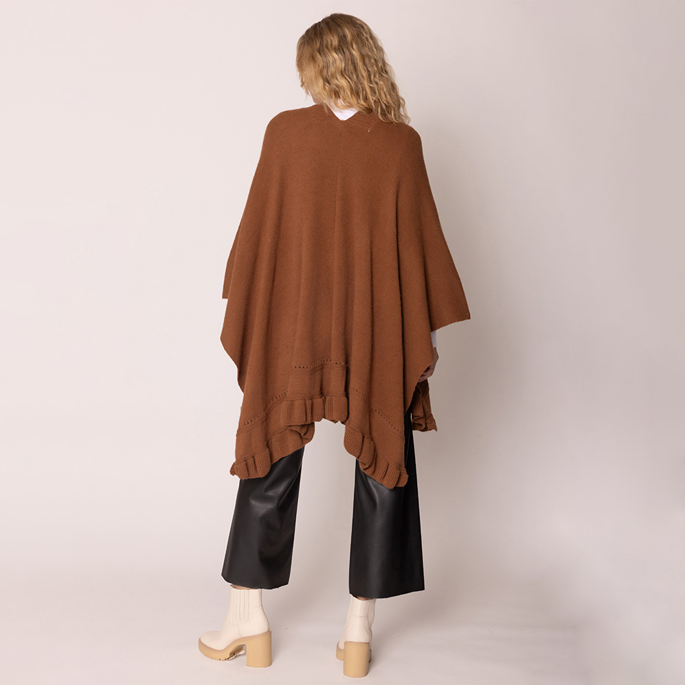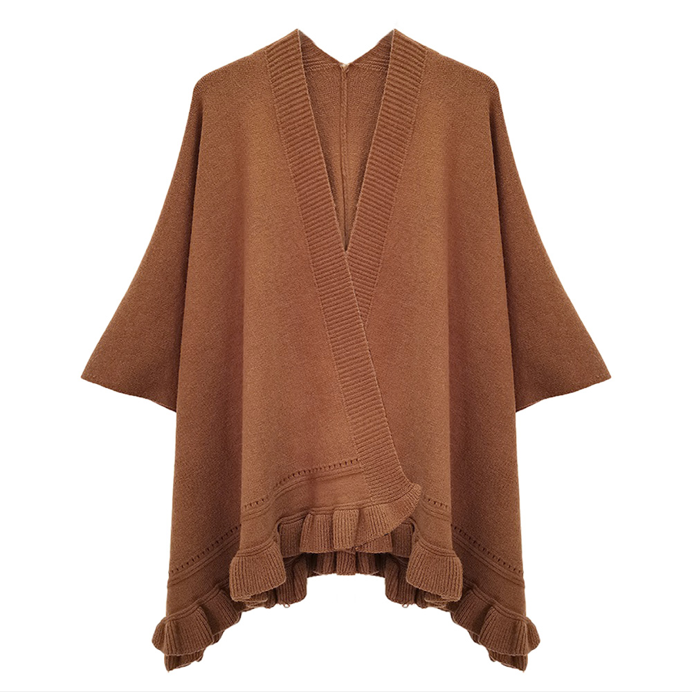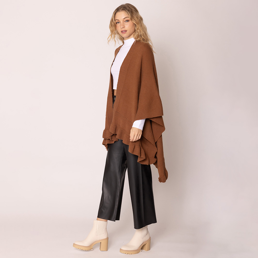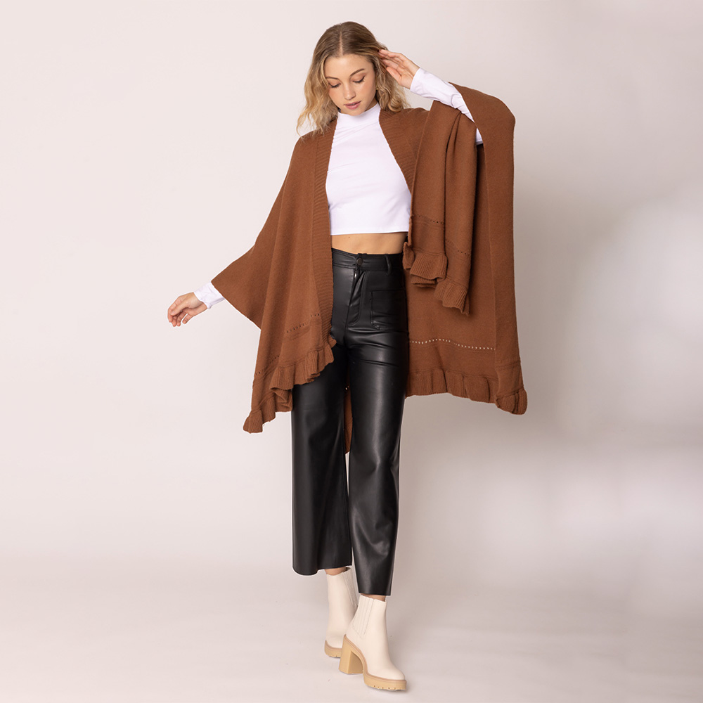 Details • Size : 41.3" X 27.6" • Material : 100% Acrylic • Add charm to your wardrobe with this open front knit cape featuring a flowing silhouette and ruffled hem detailing. Lightweight and versatile, it’s perfect for layering over casual or dressy looks, offering comfort, warmth, and effortless elegance for any season or occasion.