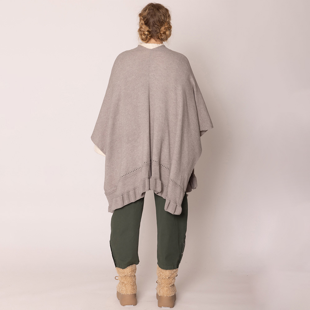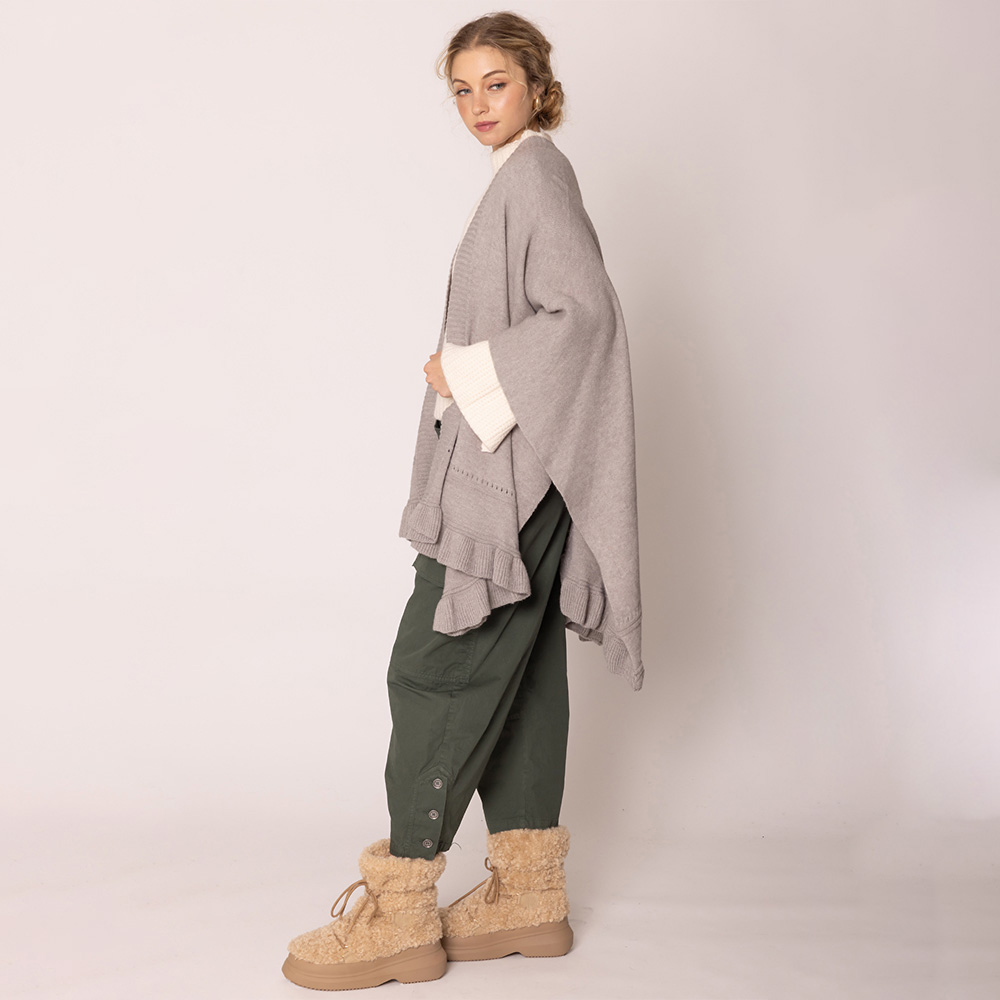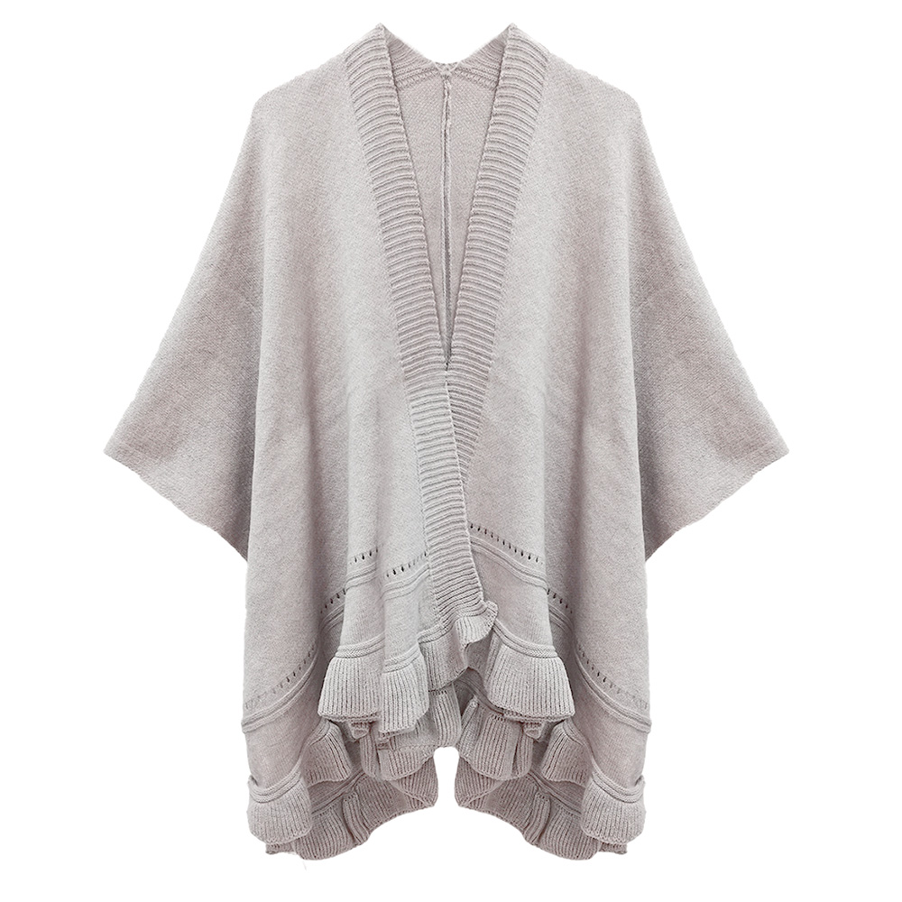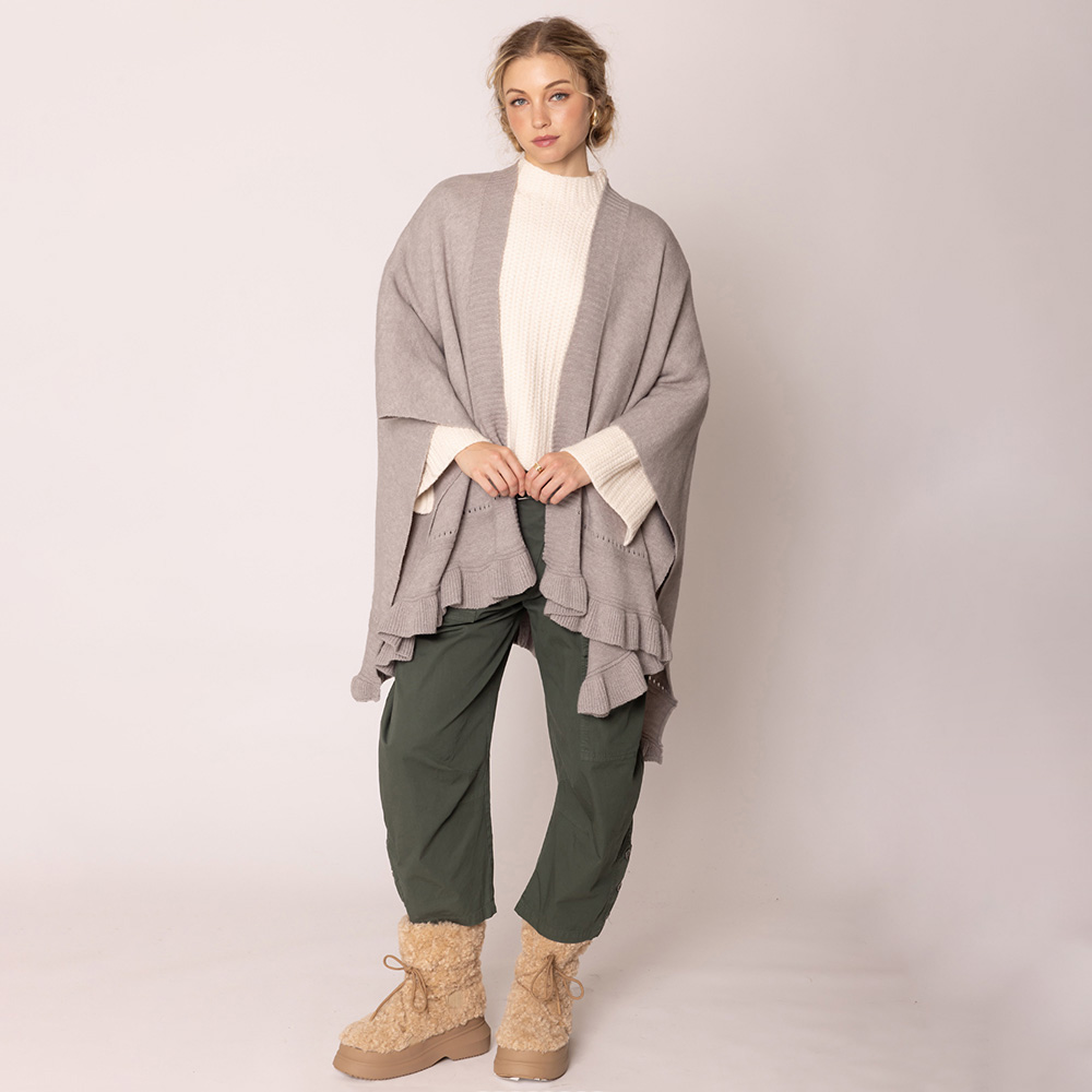 Details • Size : 41.3" X 27.6" • Material : 100% Acrylic • Add charm to your wardrobe with this open front knit cape featuring a flowing silhouette and ruffled hem detailing. Lightweight and versatile, it’s perfect for layering over casual or dressy looks, offering comfort, warmth, and effortless elegance for any season or occasion.