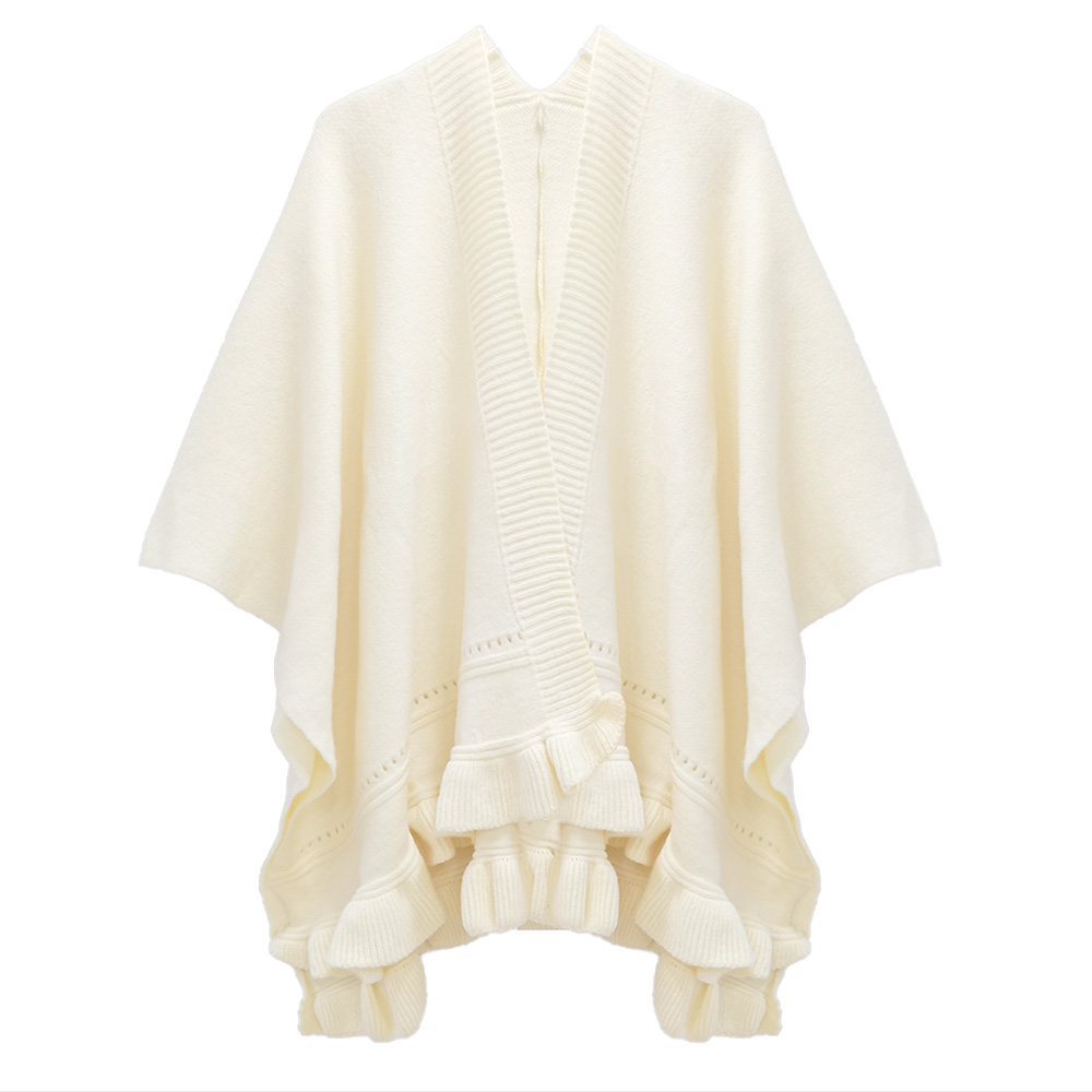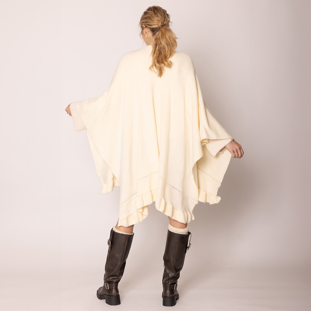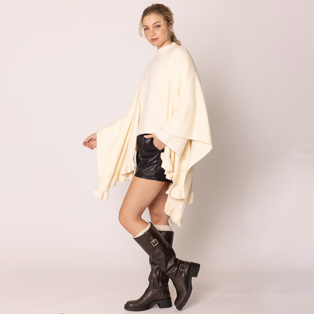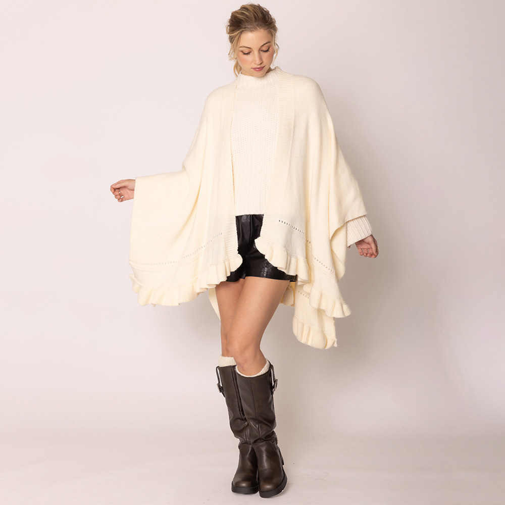 • Add charm to your wardrobe with this open front knit cape featuring a flowing silhouette and ruffled hem detailing. Lightweight and versatile, it’s perfect for layering over casual or dressy looks, offering comfort, warmth, and effortless elegance for any season or occasion.
