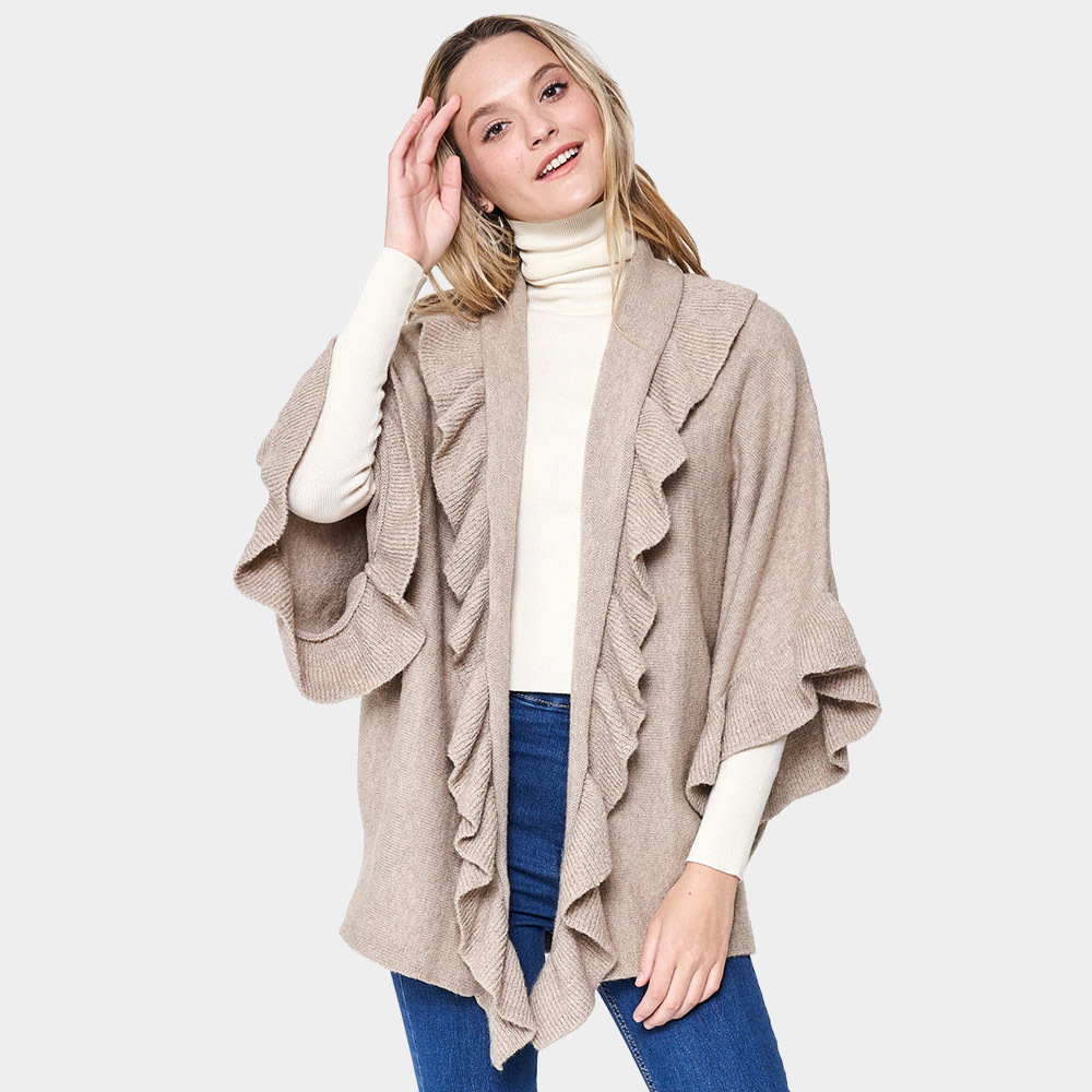 • Elevate your outfit with this elegant ruffled shawl wrap. Featuring cascading ruffle trim and an open front, it drapes beautifully for a feminine touch. Perfect for layering over casual or dressy looks, this versatile wrap adds style and comfort to any season wardrobe.