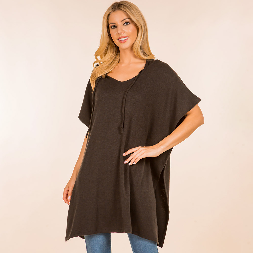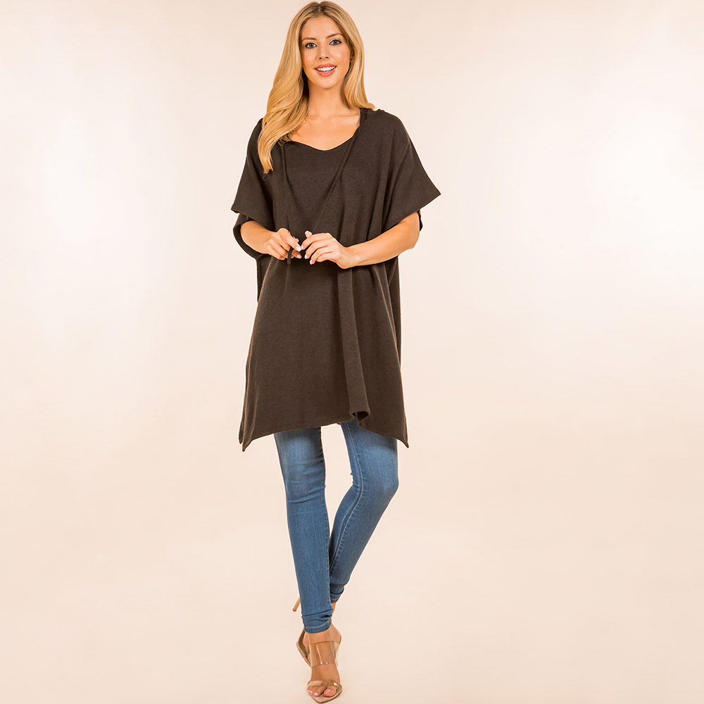 • Stay warm and stylish in this hooded poncho, perfect for layering year-round. Featuring a relaxed silhouette and drawstring hood, this one-size outerwear is ideal for everyday comfort, travel, or lounging. A must-have wardrobe essential for effortless chic looks.