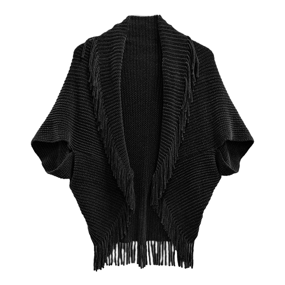• Stay cozy and stylish with this knitted shawl featuring a chic fringe trim. Its open front design and relaxed fit make it perfect for layering over any outfit. Versatile and comfortable, this shawl adds a touch of boho charm to casual looks while keeping you warm and fashionable.