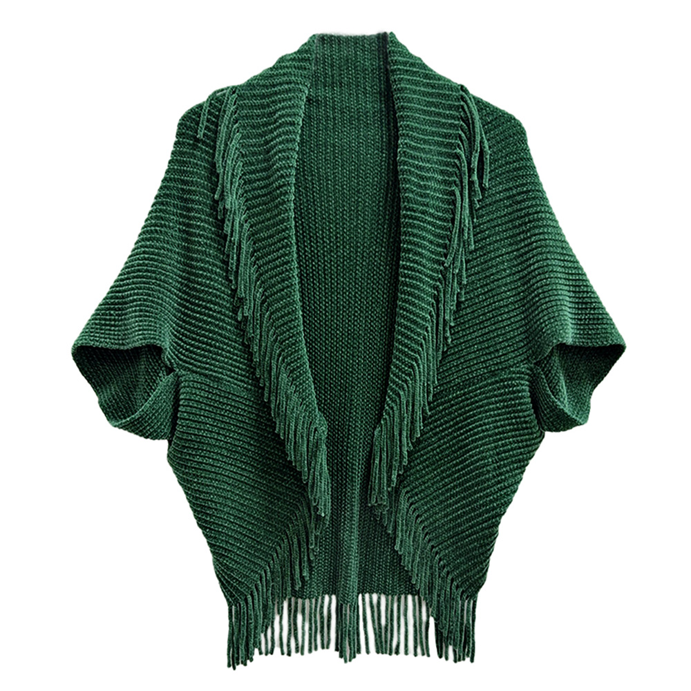 Details • Size : 35.4" X 29.9" • Tassel/Fringe Trim Size : 3.9" L • Material : 100% Acrylic • Stay cozy and stylish with this knitted shawl featuring a chic fringe trim. Its open front design and relaxed fit make it perfect for layering over any outfit. Versatile and comfortable, this shawl adds a touch of boho charm to casual looks while keeping you warm and fashionable.