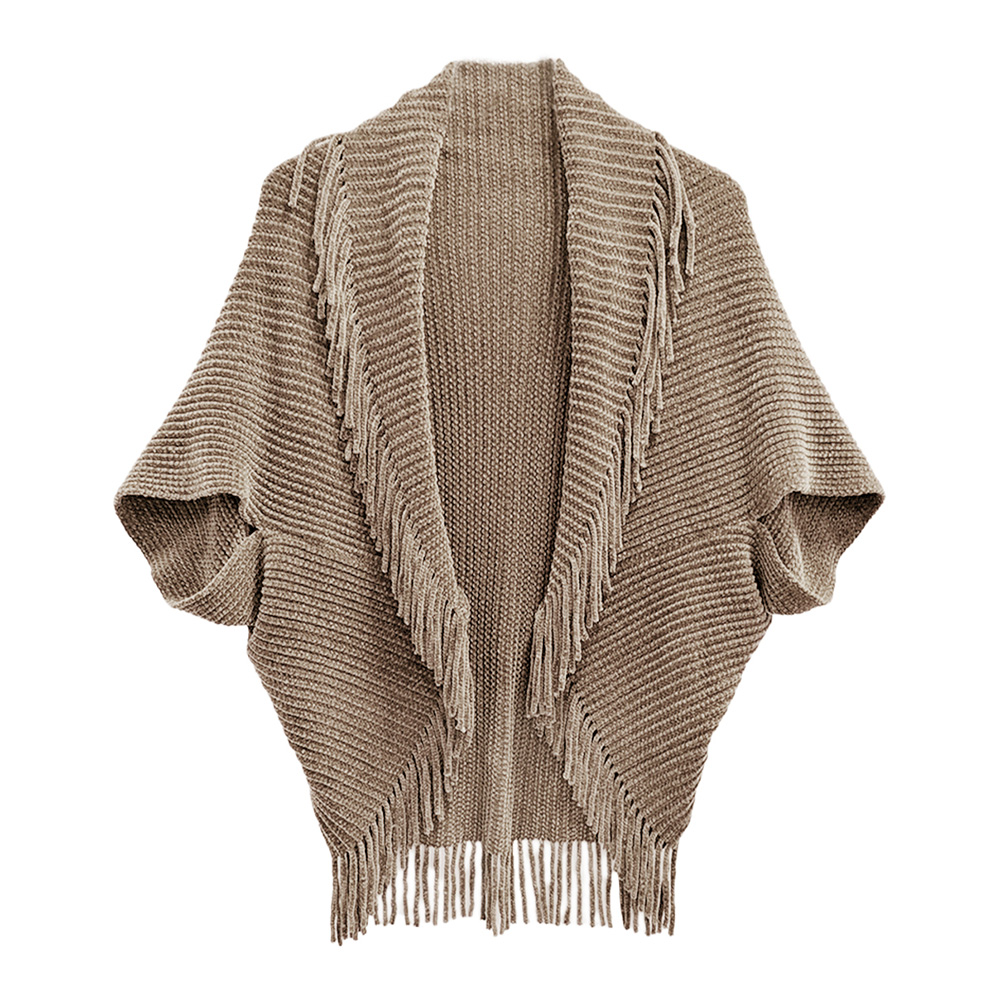 Details • Size : 35.4" X 29.9" • Tassel/Fringe Trim Size : 3.9" L • Material : 100% Acrylic • Stay cozy and stylish with this knitted shawl featuring a chic fringe trim. Its open front design and relaxed fit make it perfect for layering over any outfit. Versatile and comfortable, this shawl adds a touch of boho charm to casual looks while keeping you warm and fashionable.