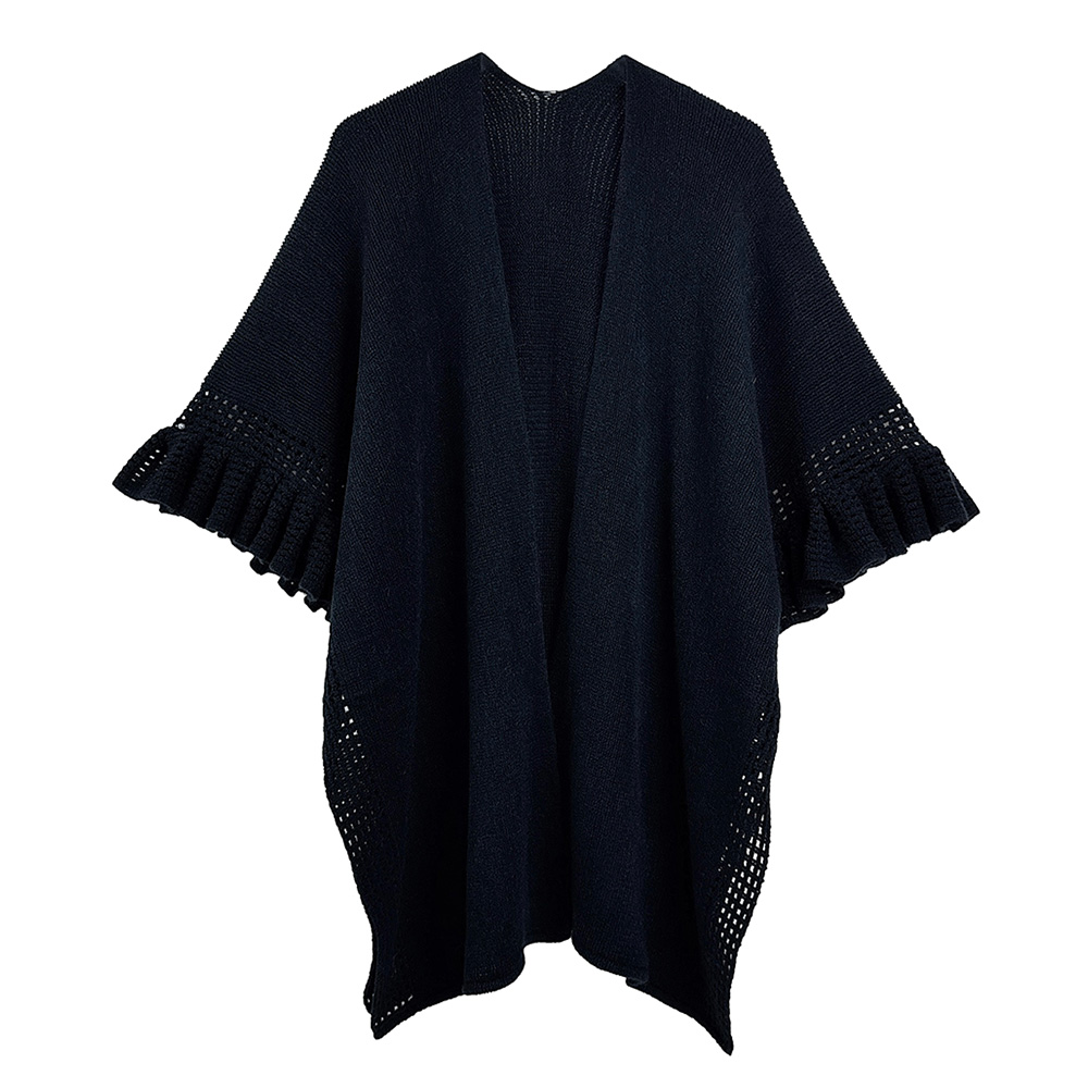 Solid Knit Open Front Punched Ruffle Sleeves Kimono Poncho