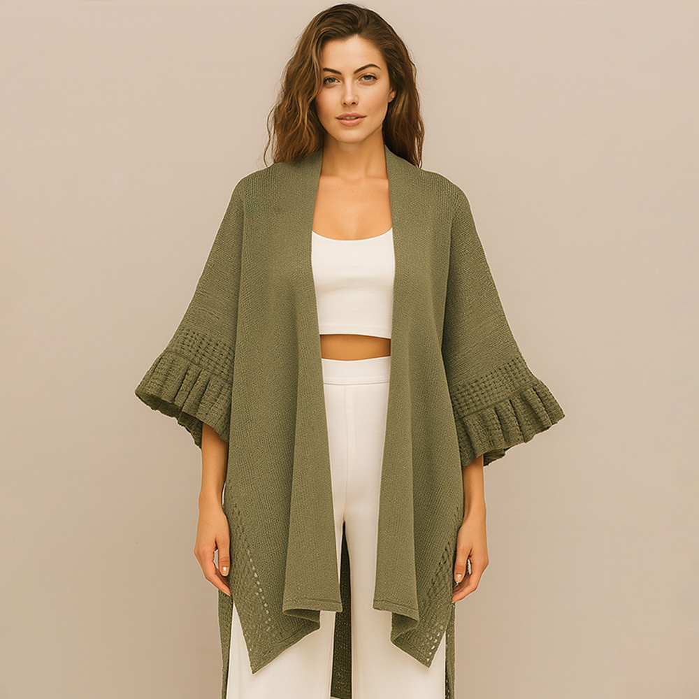 • Elevate your layering style with this open front knit cape featuring pleated sleeve details for a refined look. Its relaxed drape and versatile silhouette make it ideal for casual and elegant outfits, offering comfort, warmth, and effortless sophistication for any season or occasion.