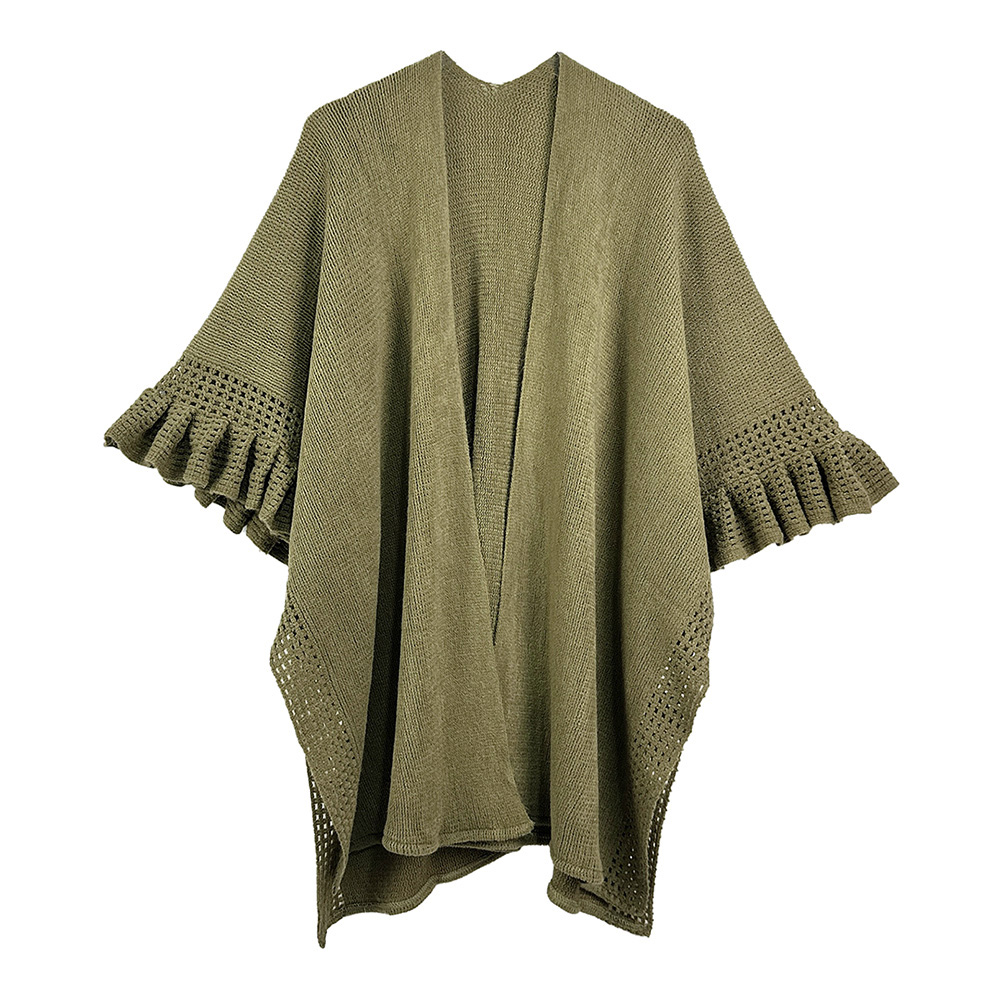 Solid Knit Open Front Punched Ruffle Sleeves Kimono Poncho Solid Knit Open Front Punched Ruffle Sleeves Kimono Poncho