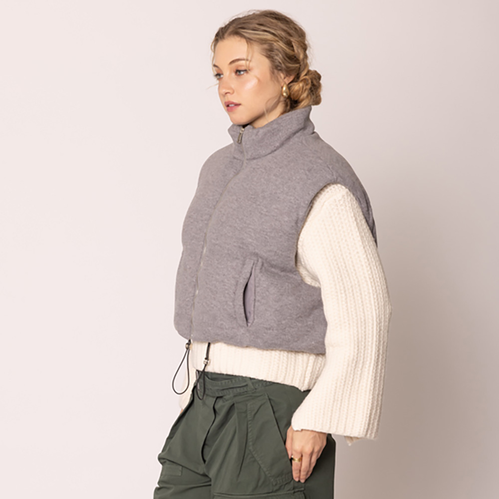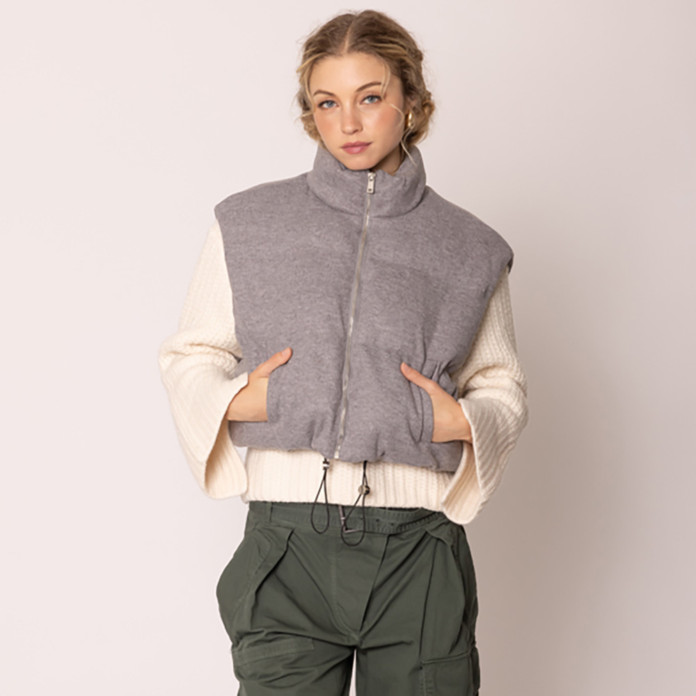 • Elevate your layered looks with this sleeveless puffer vest featuring a high neck, zip closure, and drawstring hem. Designed with front pockets for convenience, it offers both warmth and style, making it a versatile outerwear piece for casual outings and transitional seasons.