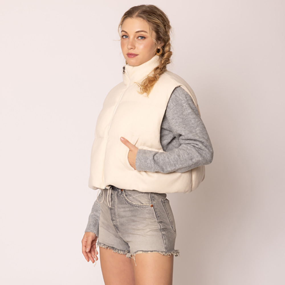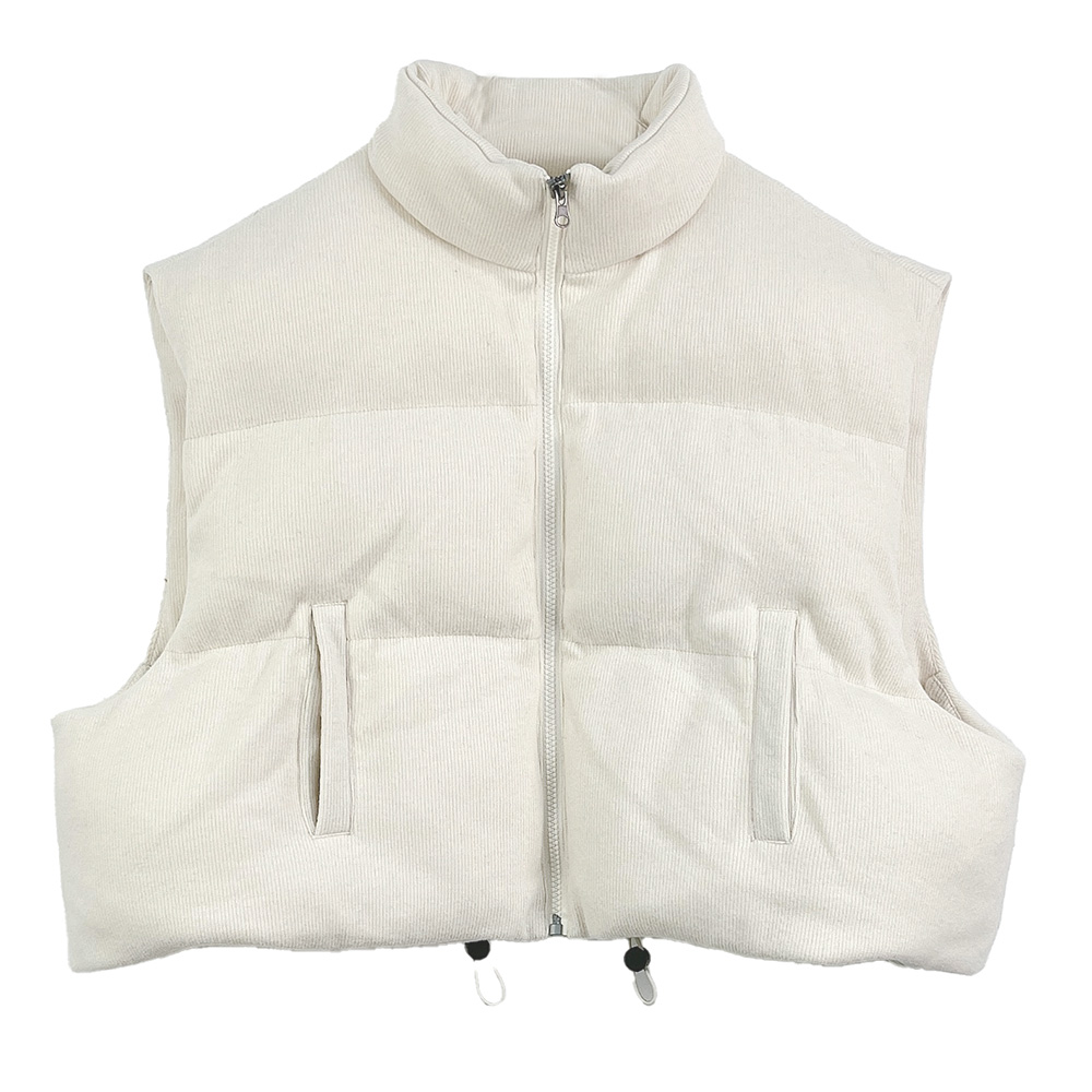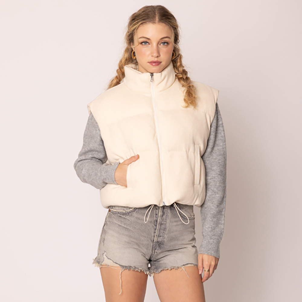 • Elevate your layered looks with this sleeveless puffer vest featuring a high neck, zip closure, and drawstring hem. Designed with front pockets for convenience, it offers both warmth and style, making it a versatile outerwear piece for casual outings and transitional seasons.
