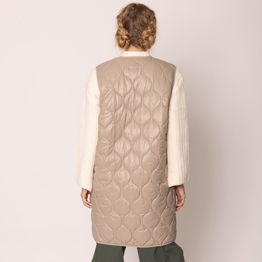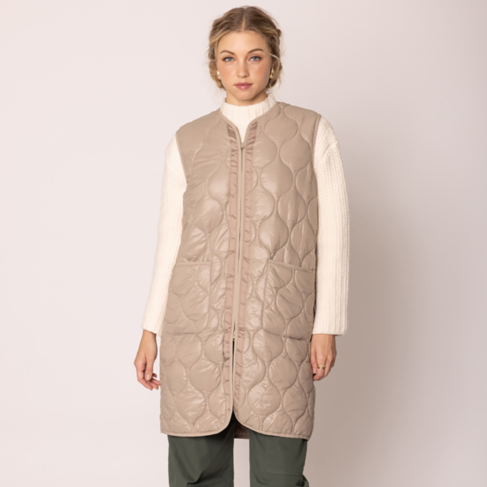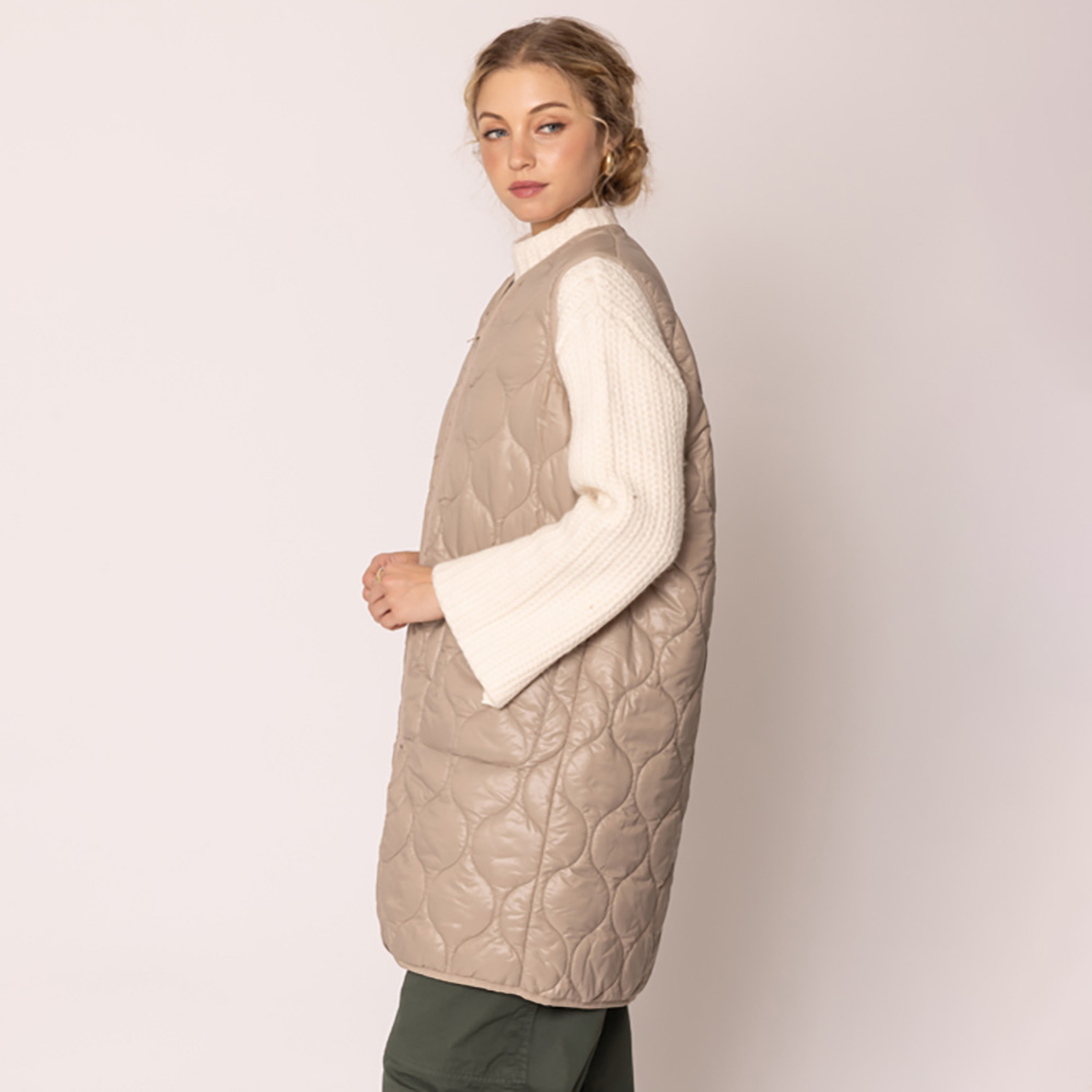 Details • Size : 37.4" X 25.6" • Material : 100% Nylon • Layer up in style with this quilted longline vest. Designed with a sleek silhouette, front pockets, and lightweight padding, it’s the perfect piece for transitional weather. The sleeveless design makes it easy to layer over sweaters or tops, while the quilted texture adds a touch of modern chic. Comfortable, versatile, and effortlessly stylish—ideal for everyday wear, travel, or casual outings.