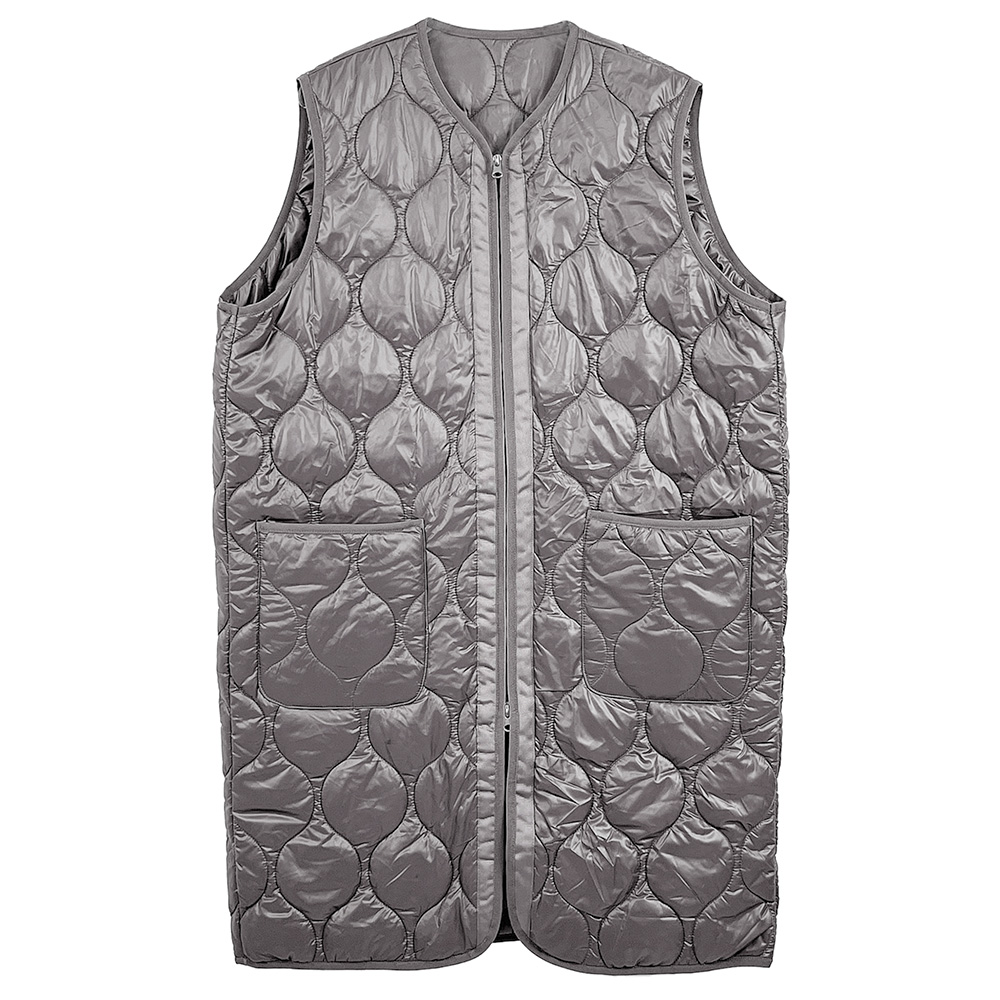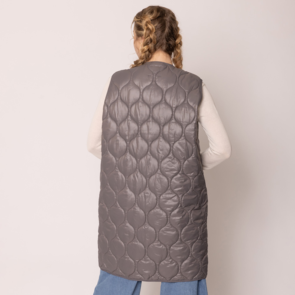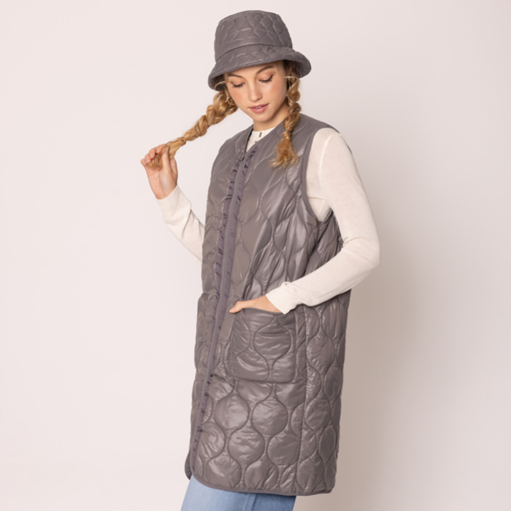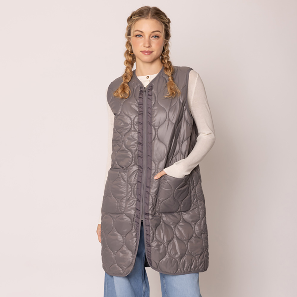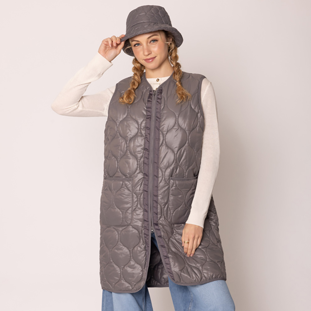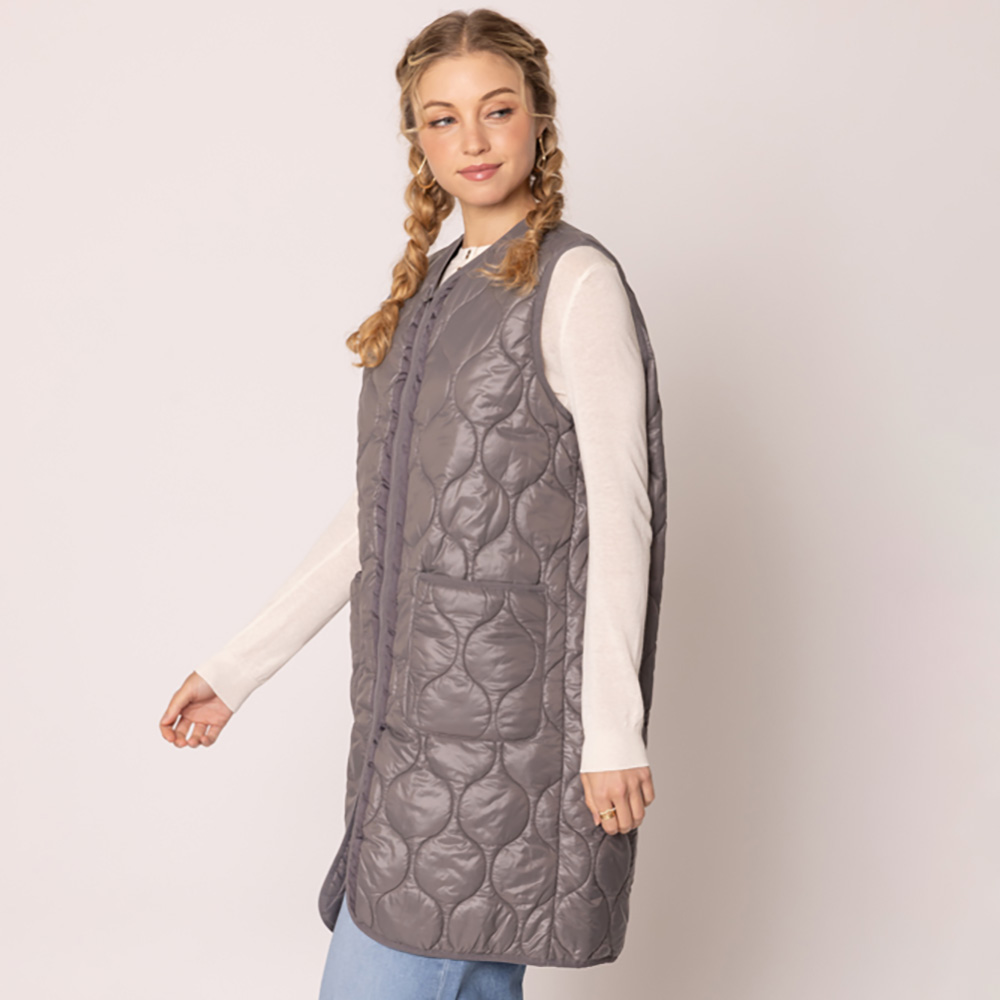 • Layer up in style with this quilted longline vest. Designed with a sleek silhouette, front pockets, and lightweight padding, it’s the perfect piece for transitional weather. The sleeveless design makes it easy to layer over sweaters or tops, while the quilted texture adds a touch of modern chic. Comfortable, versatile, and effortlessly stylish—ideal for everyday wear, travel, or casual outings.