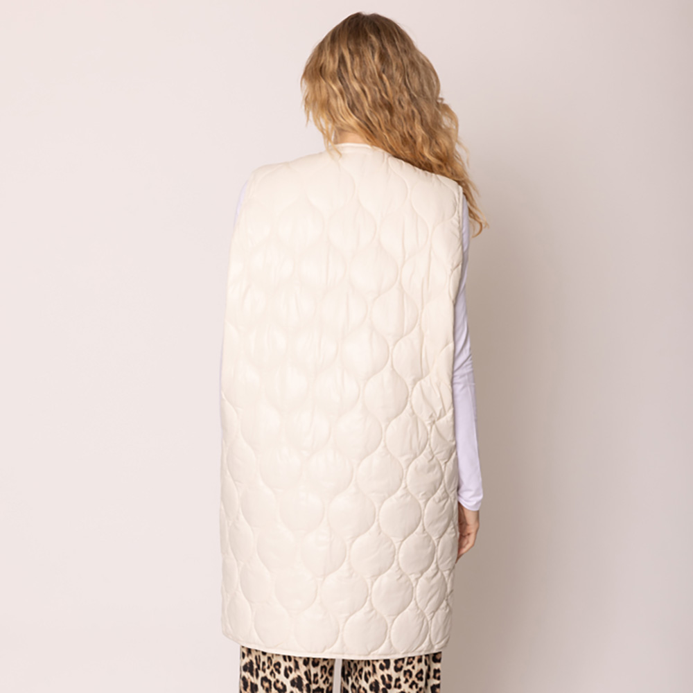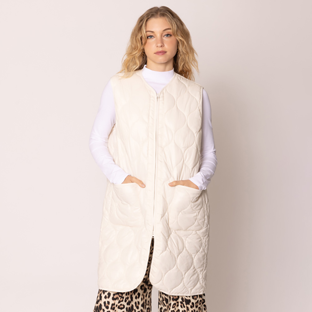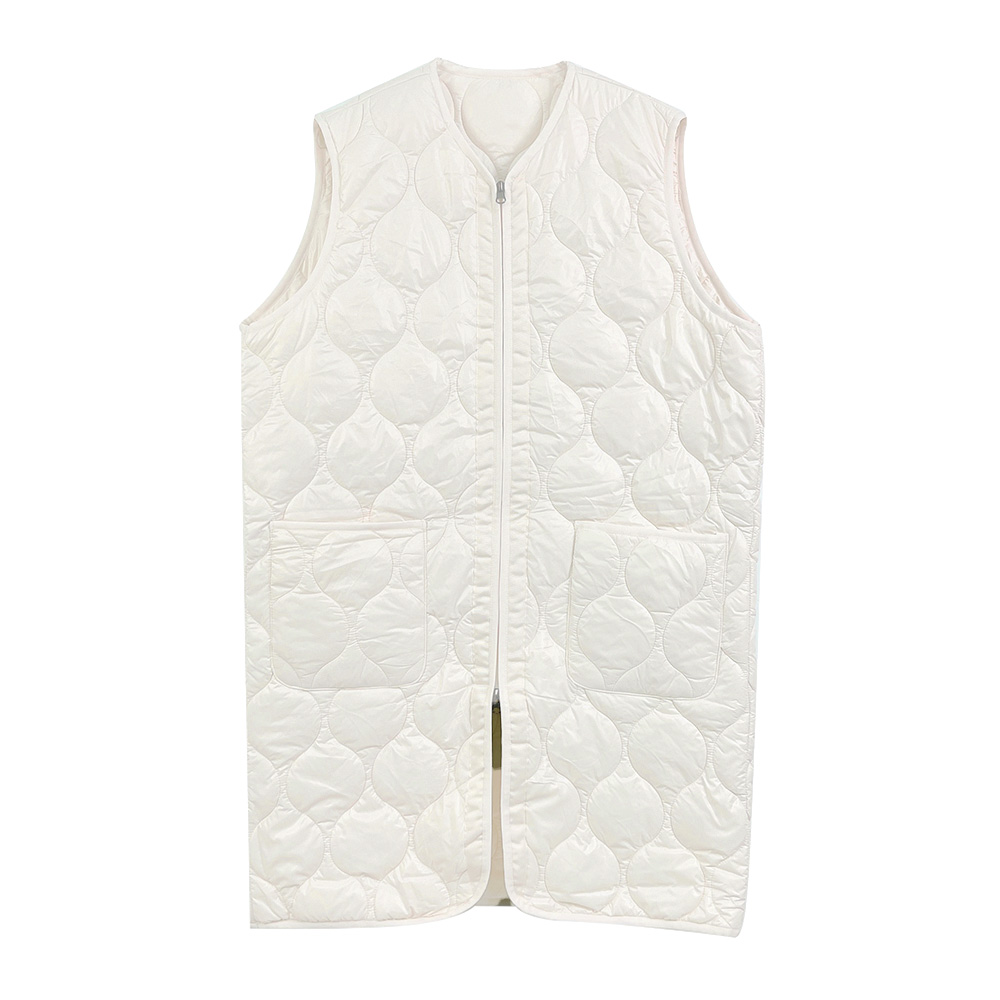 Details • Size : 37.4" X 25.6" • Material : 100% Nylon • Layer up in style with this quilted longline vest. Designed with a sleek silhouette, front pockets, and lightweight padding, it’s the perfect piece for transitional weather. The sleeveless design makes it easy to layer over sweaters or tops, while the quilted texture adds a touch of modern chic. Comfortable, versatile, and effortlessly stylish—ideal for everyday wear, travel, or casual outings.