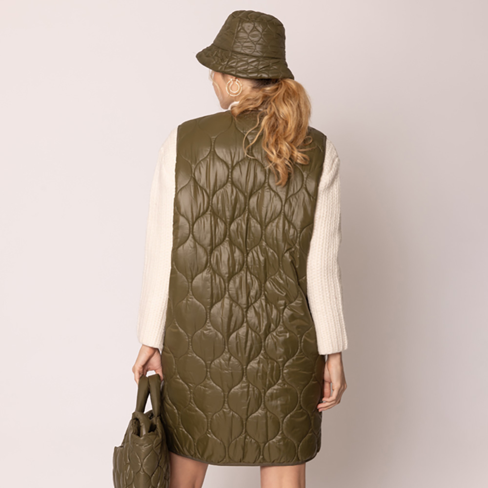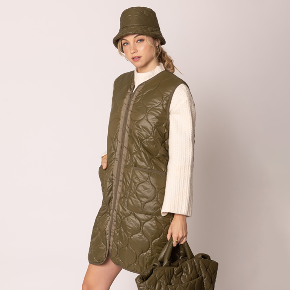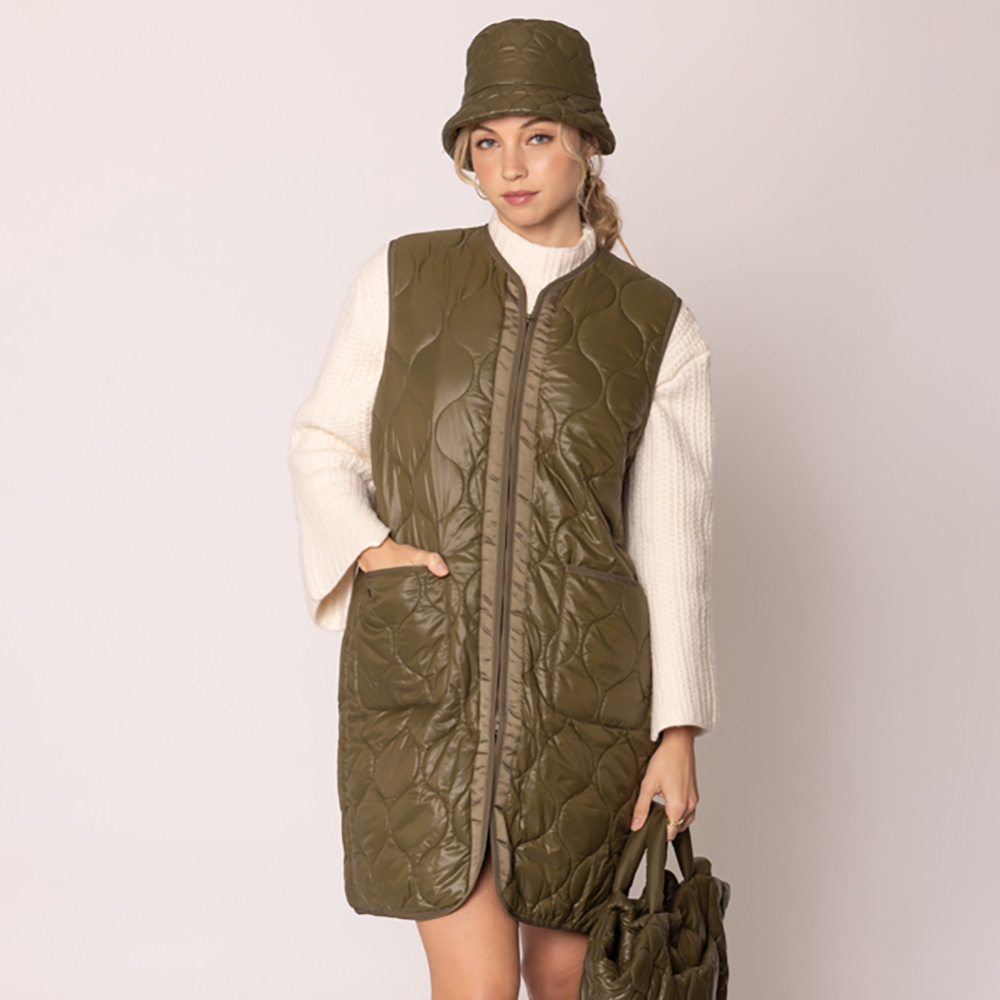 Details • Size : 37.4" X 25.6" • Material : 100% Nylon • Layer up in style with this quilted longline vest. Designed with a sleek silhouette, front pockets, and lightweight padding, it’s the perfect piece for transitional weather. The sleeveless design makes it easy to layer over sweaters or tops, while the quilted texture adds a touch of modern chic. Comfortable, versatile, and effortlessly stylish—ideal for everyday wear, travel, or casual outings.