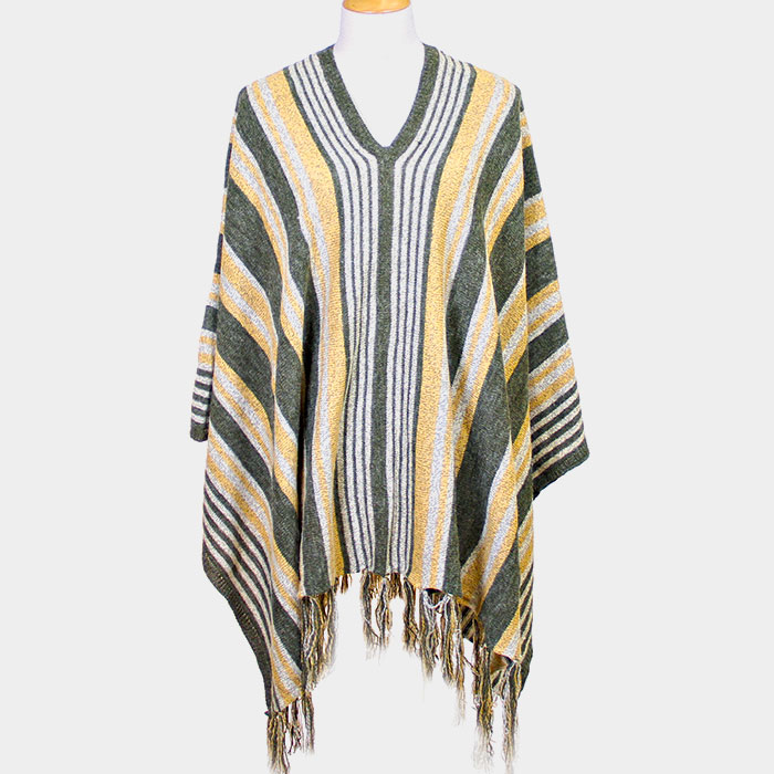 STRIPED FRINGE EDGE PONCHO SWEATER