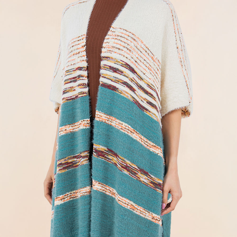 Details • Size : One Size • Material : 100% Acrylic • Elevate your look with this striped open-front poncho cardigan. Crafted from soft acrylic with fringe detailing, it offers a cozy fit and chic layering for any outfit. Perfect for casual, boho, or transitional seasonal styles.