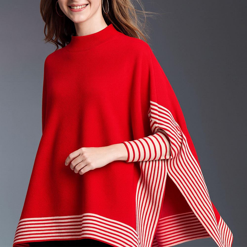 • Stylish poncho top featuring a mock neck, asymmetrical drape, and bold striped accents. A versatile one-size layering piece that offers comfort and modern elegance. Perfect for casual outfits, seasonal transitions, and everyday wear.