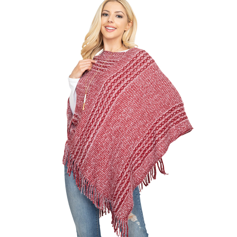 Button Neckline Fringe Trim Gradient Color Block Knit Poncho