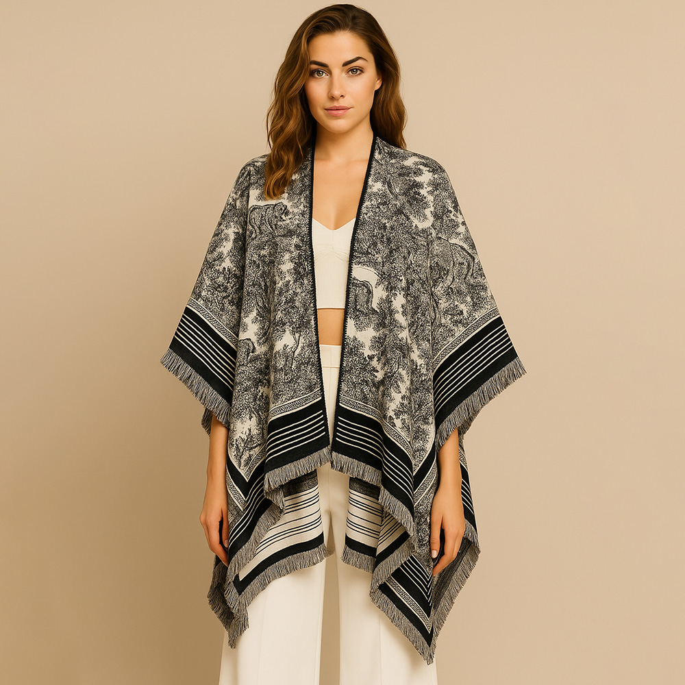 • Add a touch of sophistication to your look with this textured jacquard poncho featuring subtle patterns and delicate fringe detailing. Its soft drape and open-front design make it a versatile layering essential for effortlessly refined everyday style.