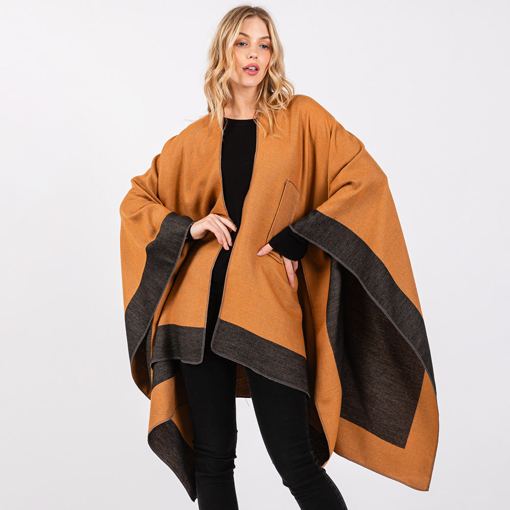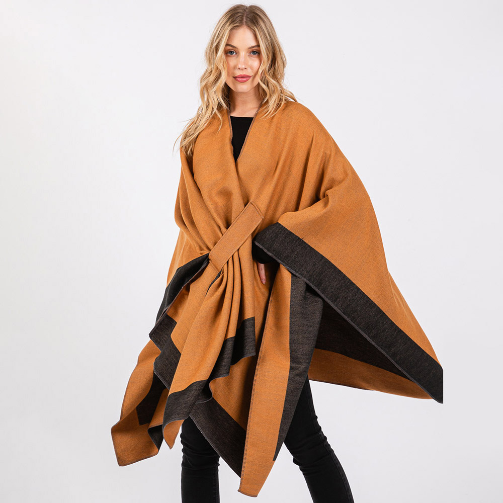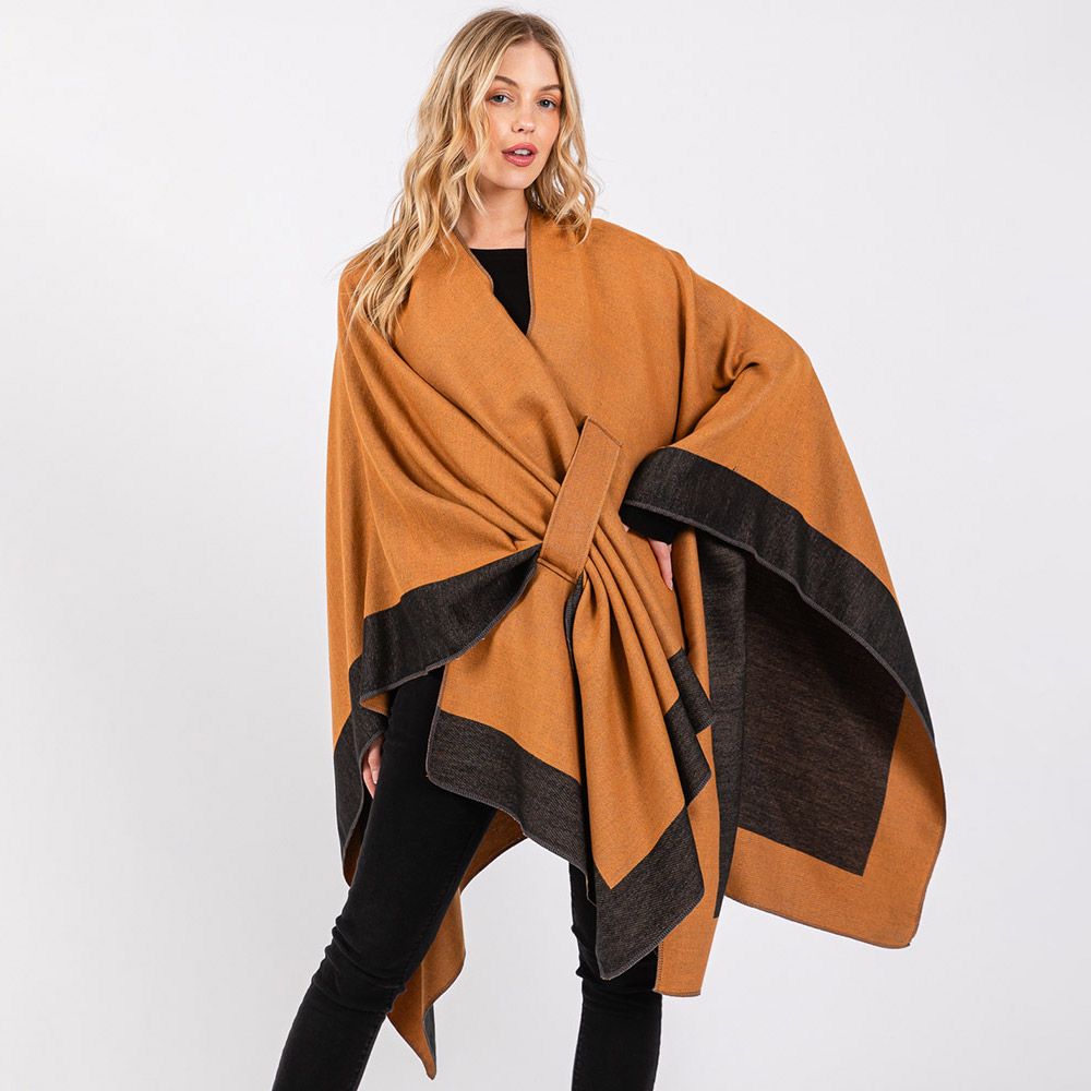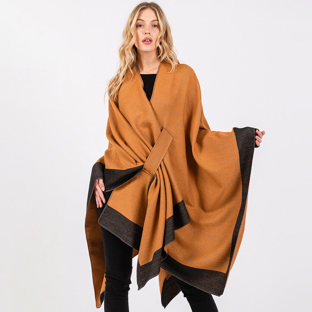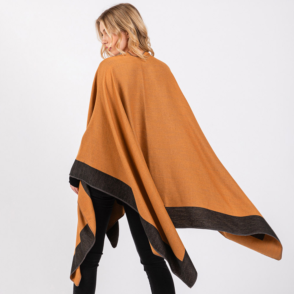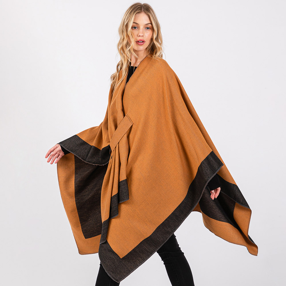 • Elevate your style with this two-tone open front shawl wrap featuring a contrasting border design. Versatile and elegant, it drapes beautifully over casual or dressy outfits, offering warmth and sophistication, making it a must-have layering accessory for any season or occasion.