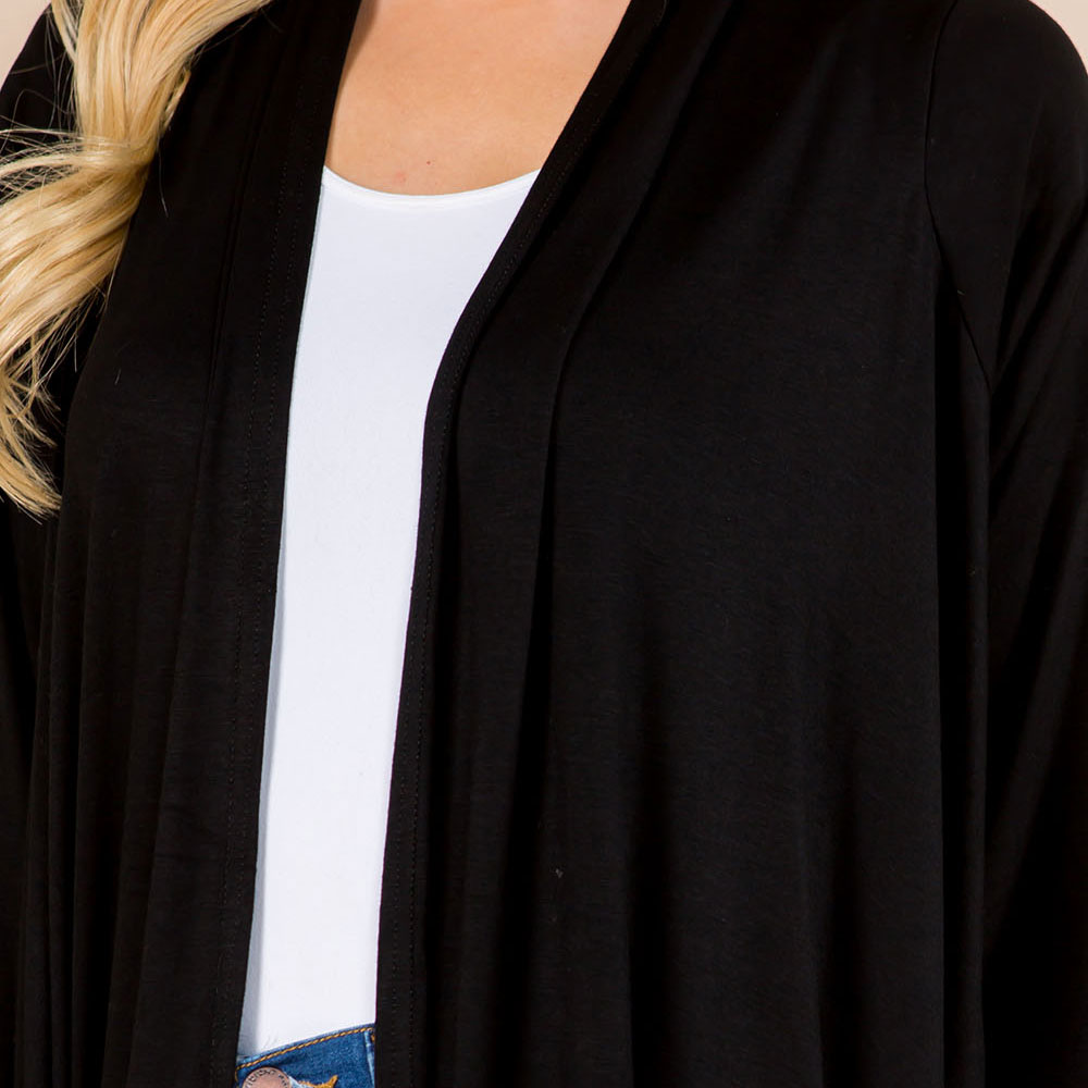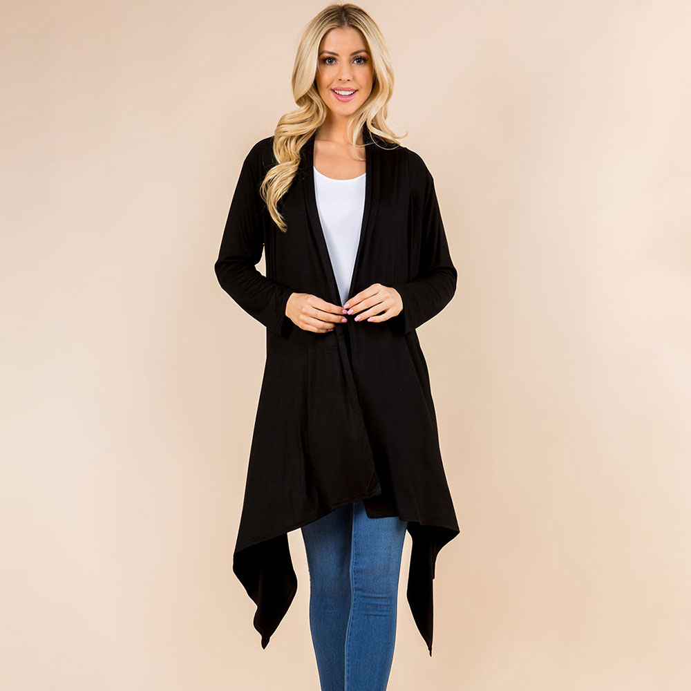• Elevate your layering game with this open front cardigan featuring an asymmetrical hem and long sleeves. Ideal for casual or dressy outfits in any season.
