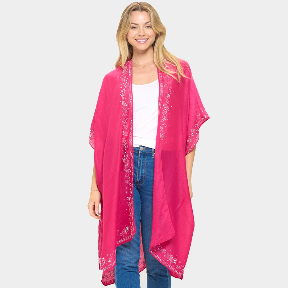 Bling Studded Leaves Pattern Pointed Kimono Poncho
