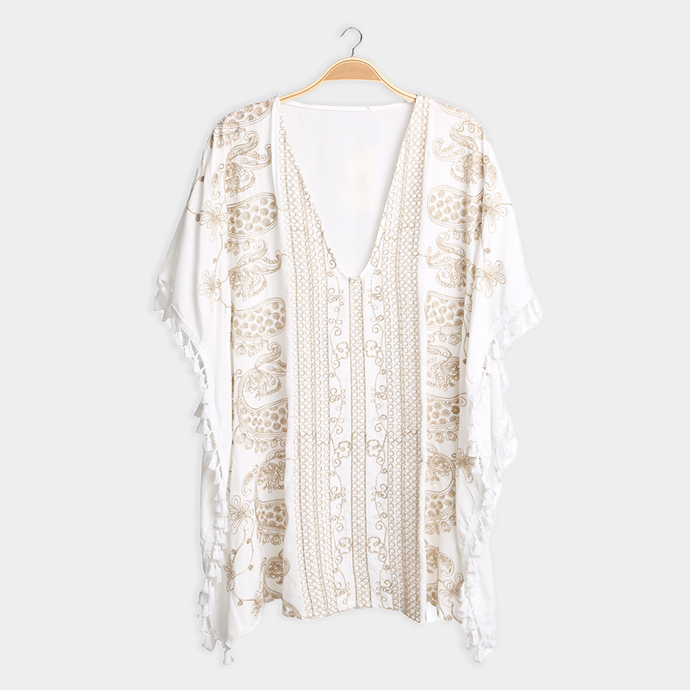 Details • Size : One Size • Material : 100% Viscose • Elegant beige embroidered kaftan with intricate paisley and floral patterns, finished with side tassel details. Crafted from soft, breathable viscose—ideal as a beach cover-up or bohemian statement piece.