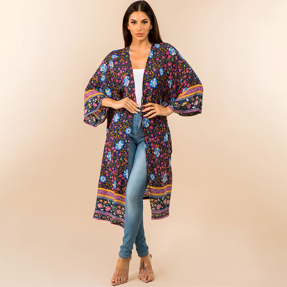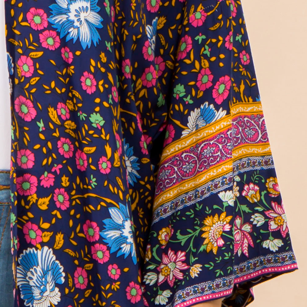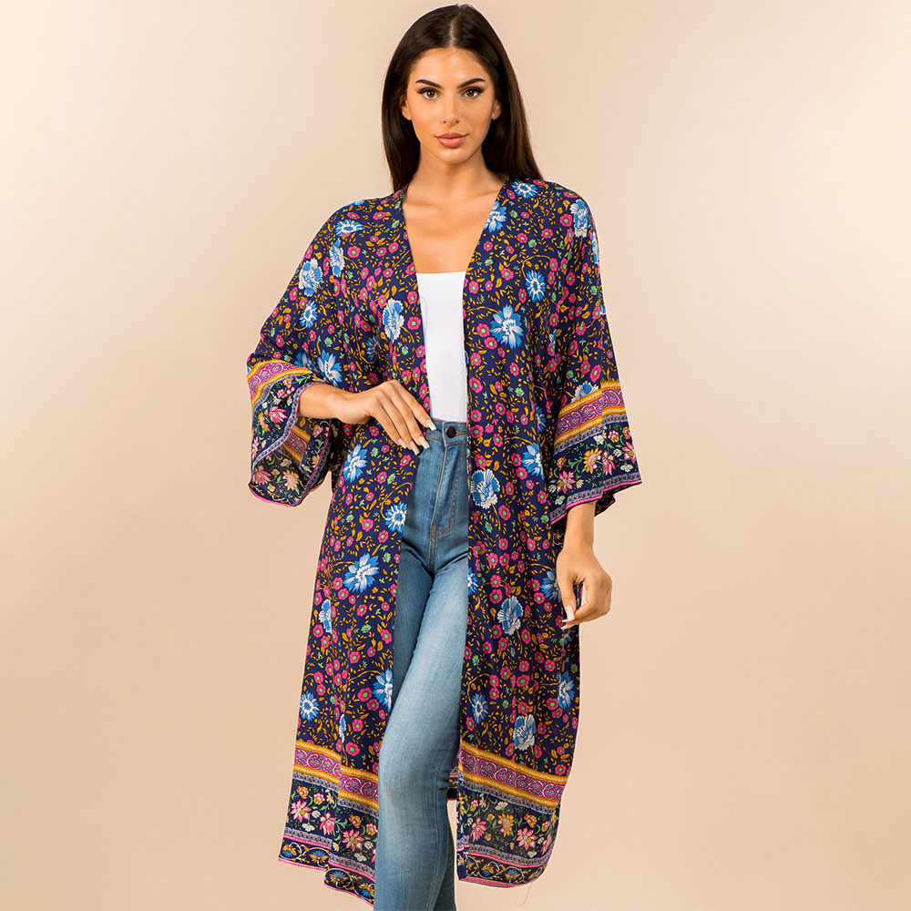 Details • Size : One Size • Material : 100% Polyester • Elevate your look with this boho-inspired floral kimono duster. Featuring bright multicolor flowers on a navy background, this lightweight, flowy cardigan adds a bold and breezy layer to any outfit. Perfect for festivals, vacations, or everyday chic.