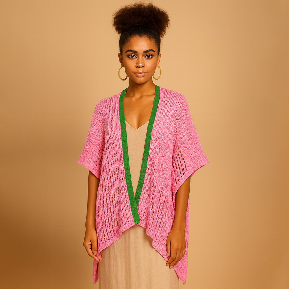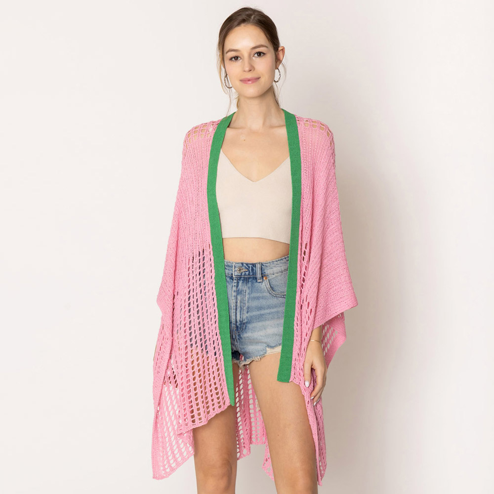Details • Size : 35.4" X 29.5" • Material : 100% Acrylic • This open knit cardigan features a breezy, airy weave with short sleeves and a striking contrast trim. Its relaxed drape and lightweight feel make it perfect for layering over dresses, tops, or casual outfits for a touch of texture and style.