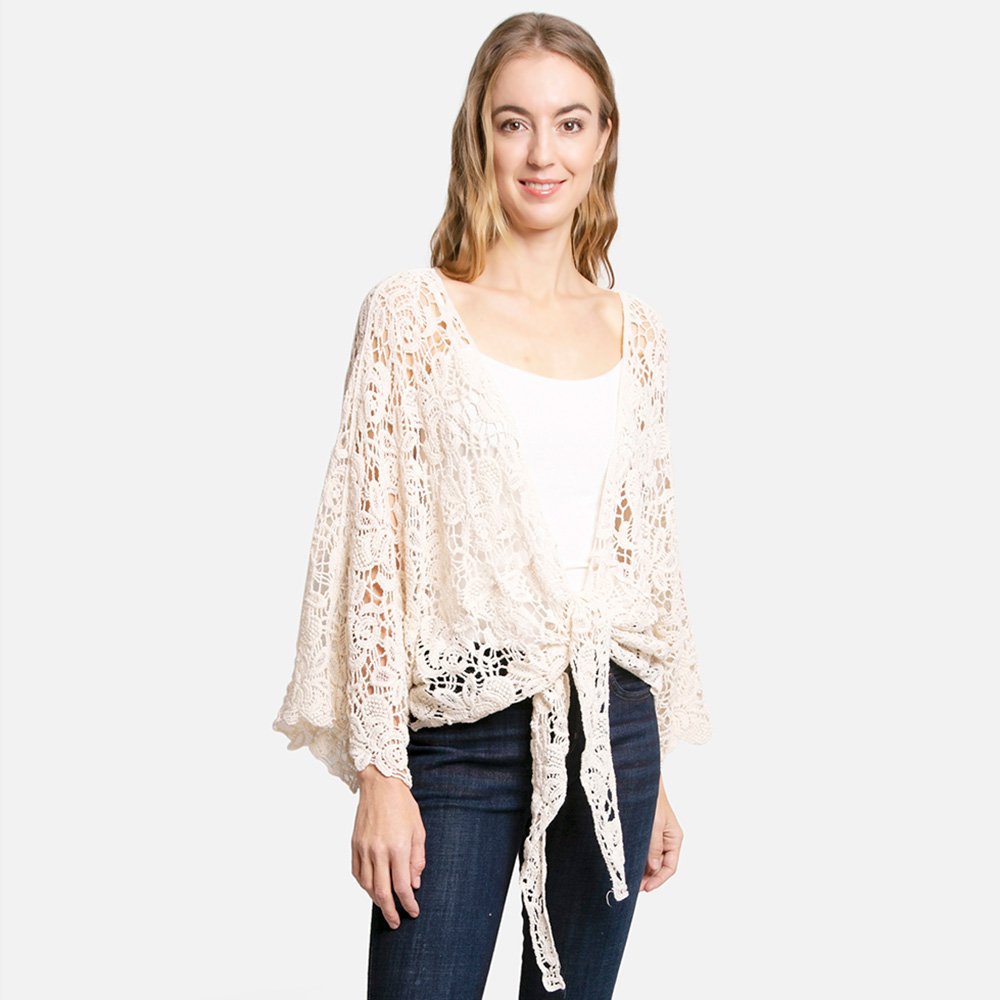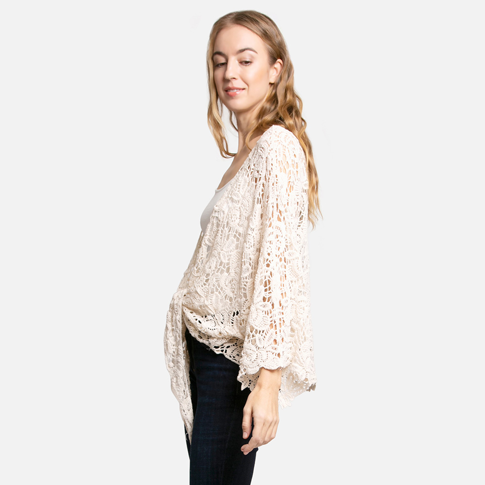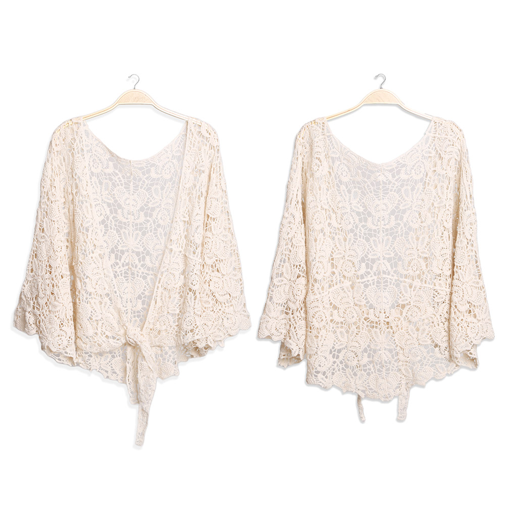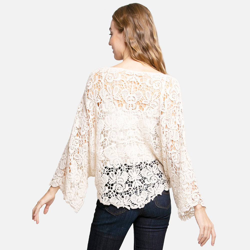 Floral Patterned Crochet Short Batwing Cover Up Poncho