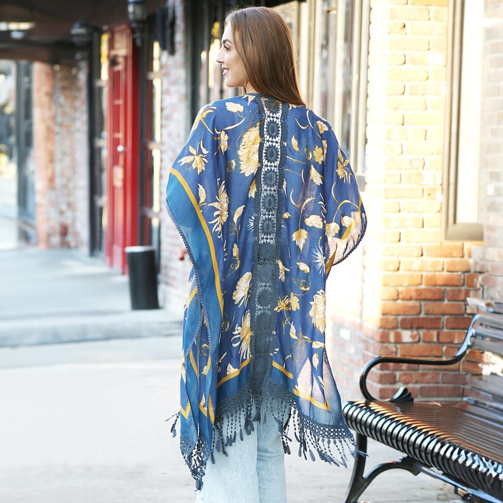 Floral Printed Cover Up Kimono Poncho With Tassels